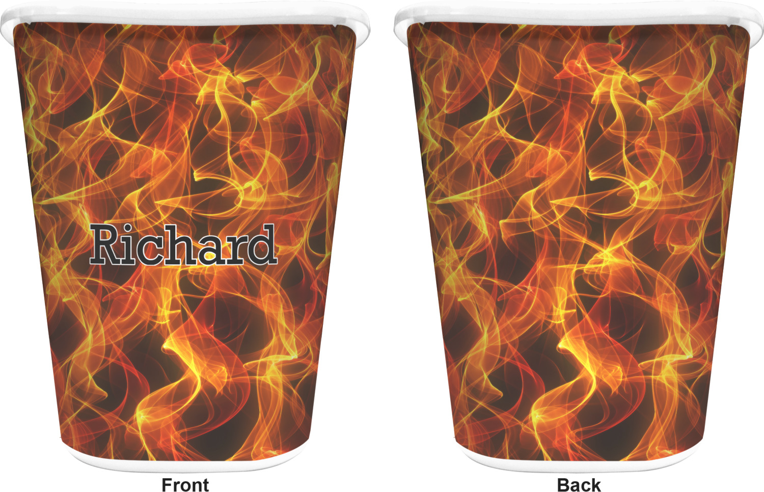You can choose to purchase these decorative wastebaskets in either a white or a black color that will show on the base and the upper rim. Your customization is printed on a high-gloss, fine-quality vinyl adhesive, and you can choose to either have this adhesive applied to one side only or to both sides. As such, this plastic wastebasket can be single-sided or double-sided, depending on your creative vision. Your customization is printed using durable inks, making the design waterproof and resistant to fading over time.