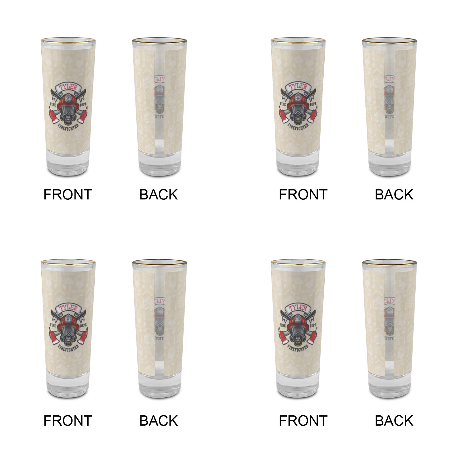 These glass shooter glasses are printed in full color with the design of your choice. These are a tall shooter 2 oz size and stand 4" tall. The print is a full wrap design to boldly display your personalization.