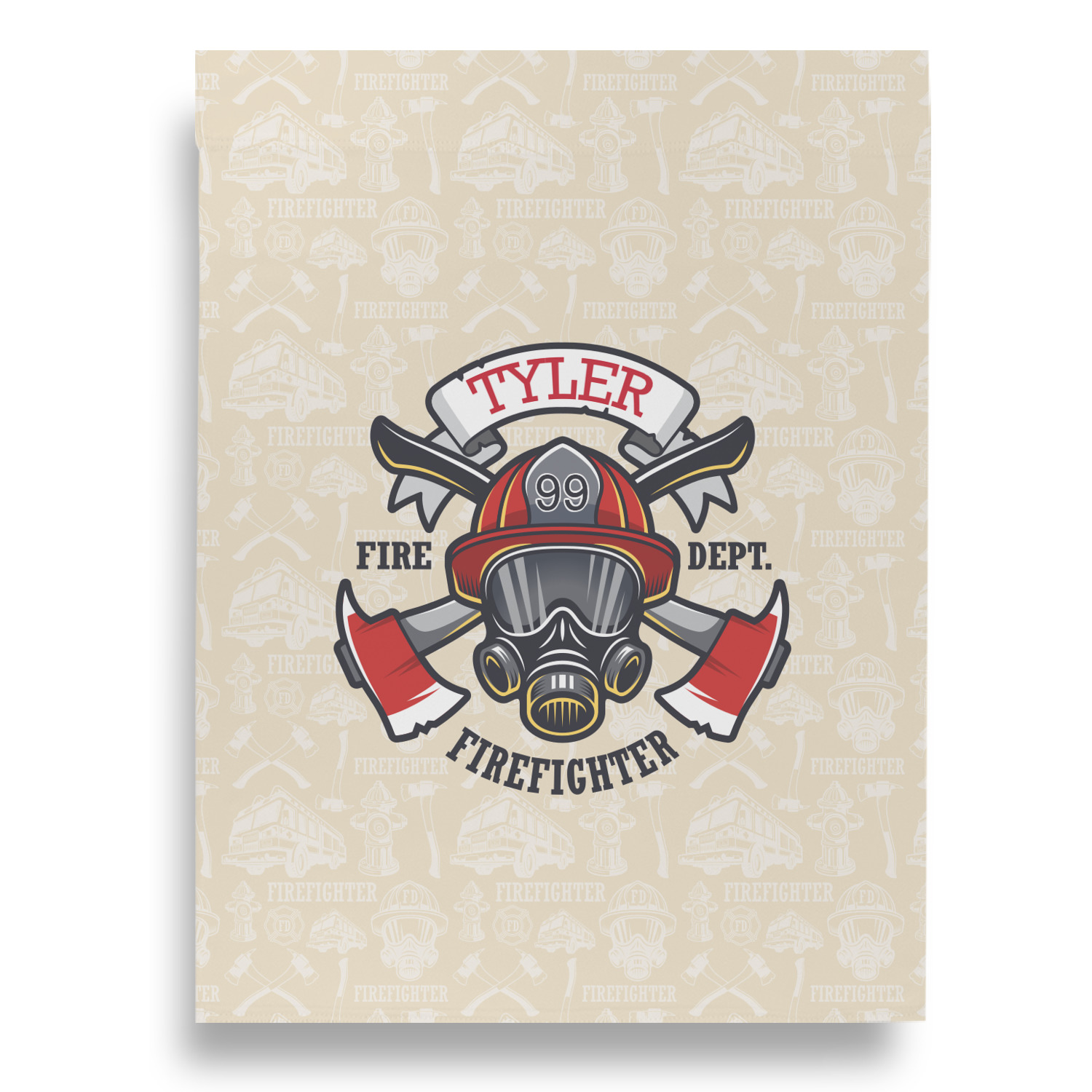 This design features a beautiful illustration of a firefighter's gear with axes. The top banner is where your personalization goes and underneath it says "Firefighter." The main colors are red and grey. The background is a cream and light cream color and has all kinds of fun firefighter symbols and illustrations. This is the perfect way to say thank you to the firefighter in your life.