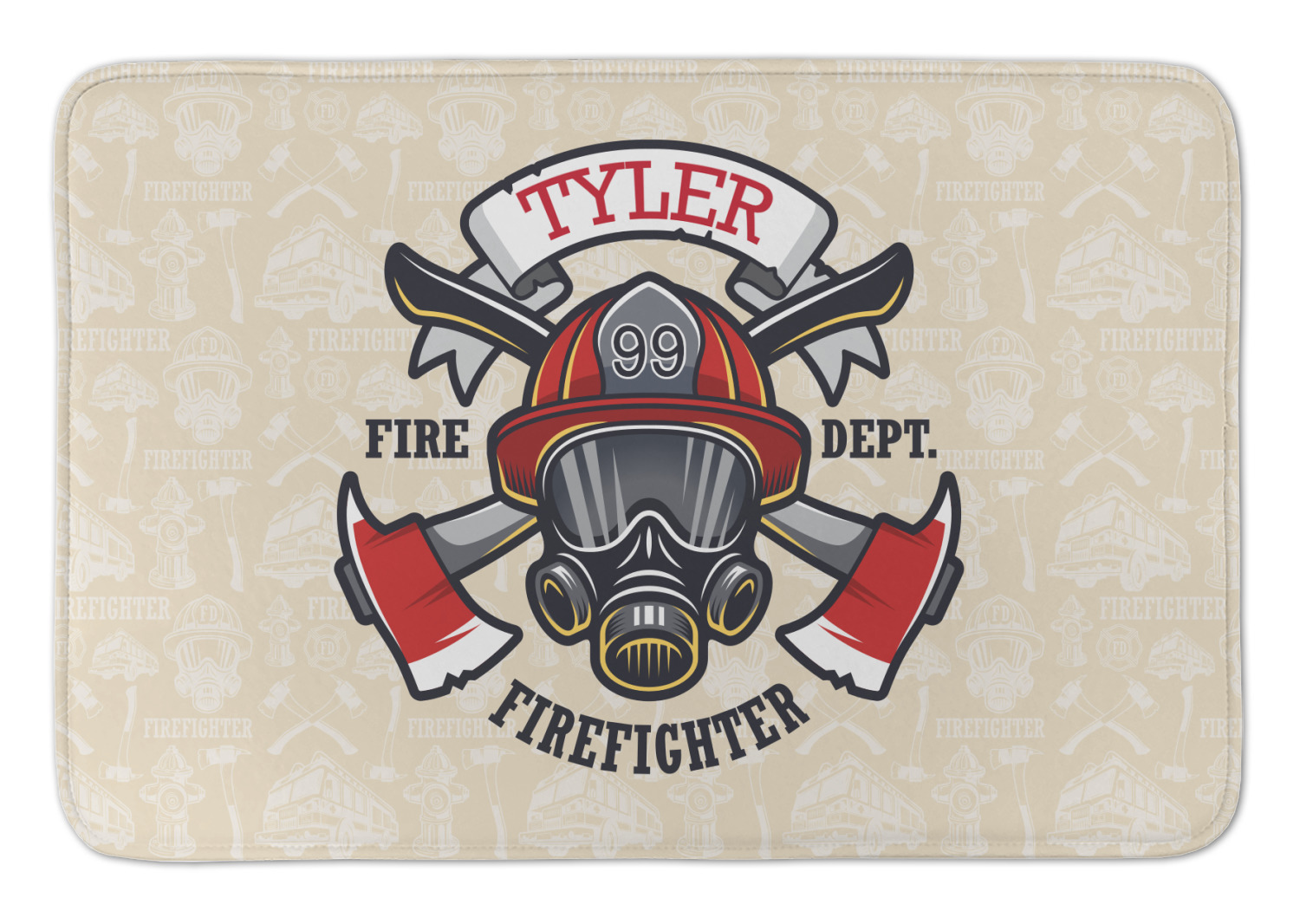 This design features a beautiful illustration of a firefighter's gear with axes. The top banner is where your personalization goes and underneath it says "Firefighter." The main colors are red and grey. The background is a cream and light cream color and has all kinds of fun firefighter symbols and illustrations. This is the perfect way to say thank you to the firefighter in your life.