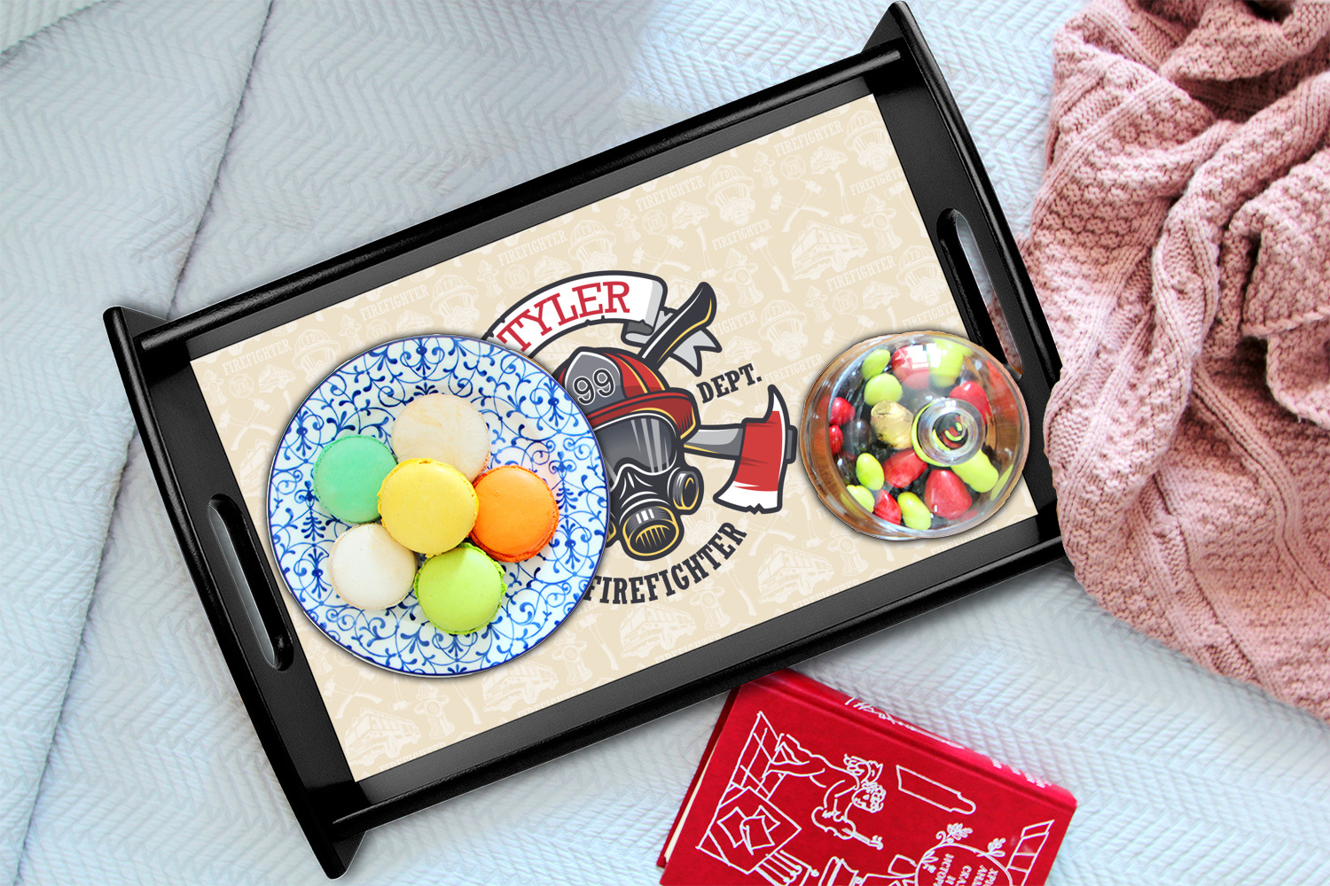 This design features a beautiful illustration of a firefighter's gear with axes. The top banner is where your personalization goes and underneath it says "Firefighter." The main colors are red and grey. The background is a cream and light cream color and has all kinds of fun firefighter symbols and illustrations. This is the perfect way to say thank you to the firefighter in your life.