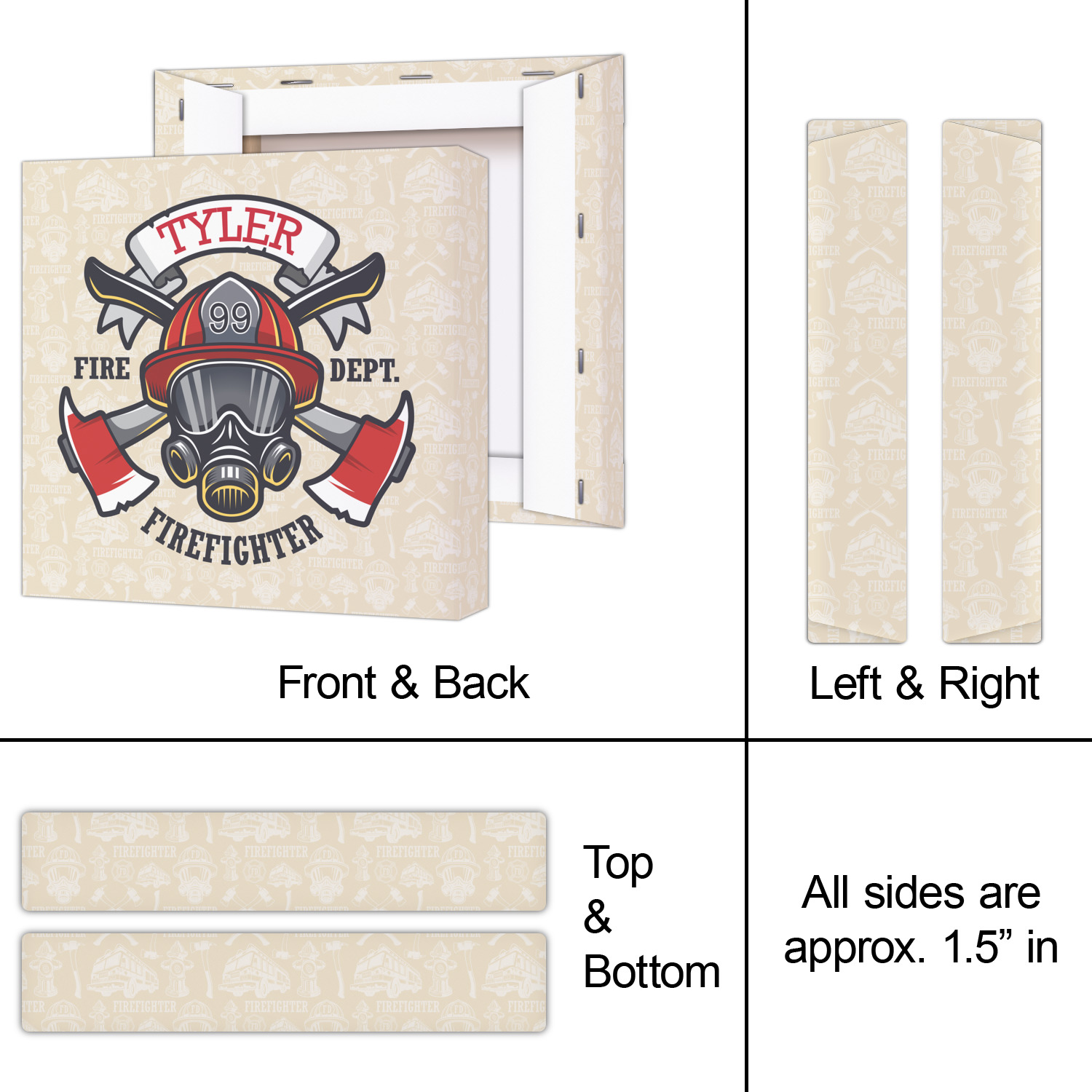 This design features a beautiful illustration of a firefighter's gear with axes. The top banner is where your personalization goes and underneath it says "Firefighter." The main colors are red and grey. The background is a cream and light cream color and has all kinds of fun firefighter symbols and illustrations. This is the perfect way to say thank you to the firefighter in your life.