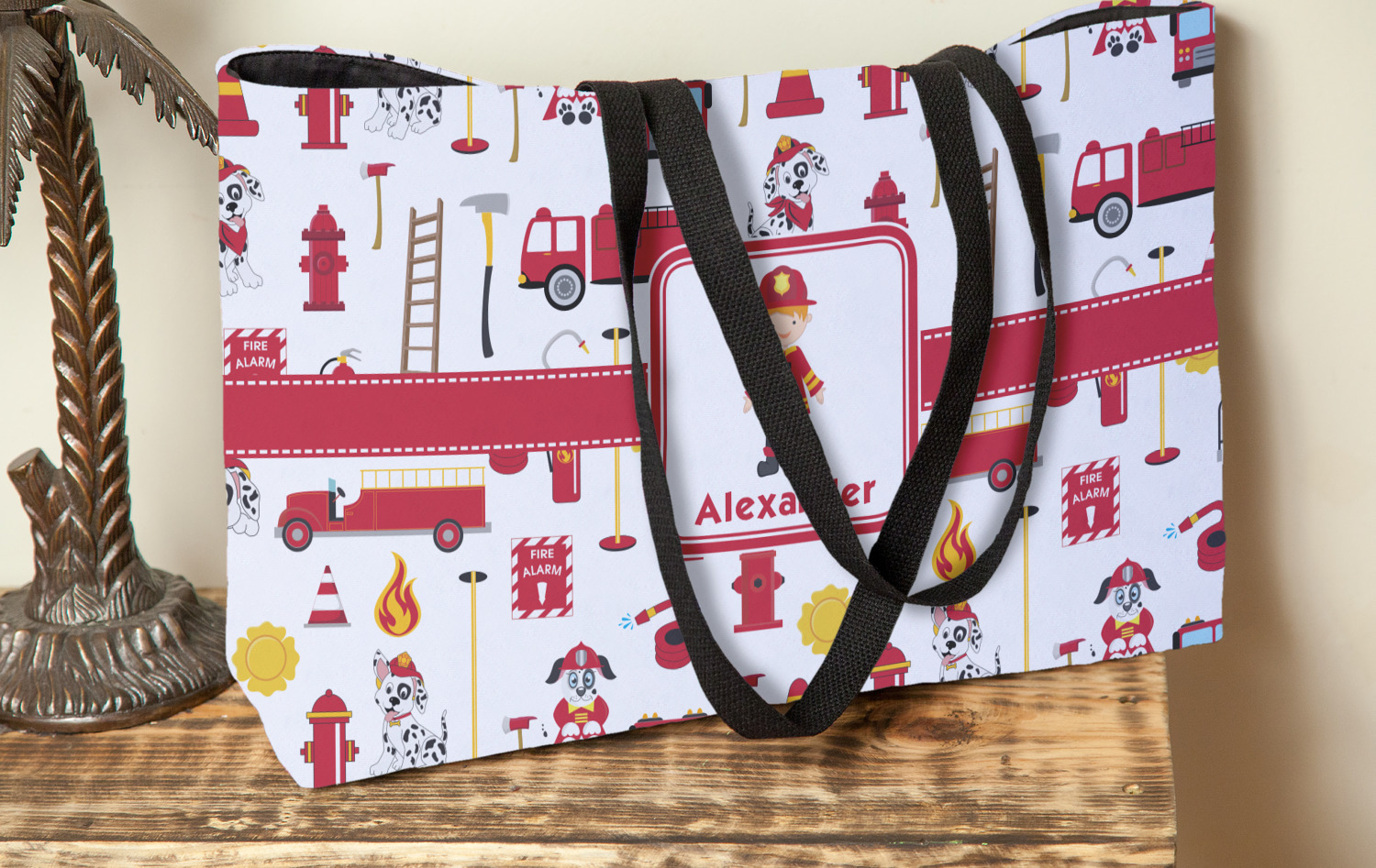 These beach totes are handmade here in the USA. Fabric is printed with your design. The tote is then sewn from the fabric pieces, lining and handles added.