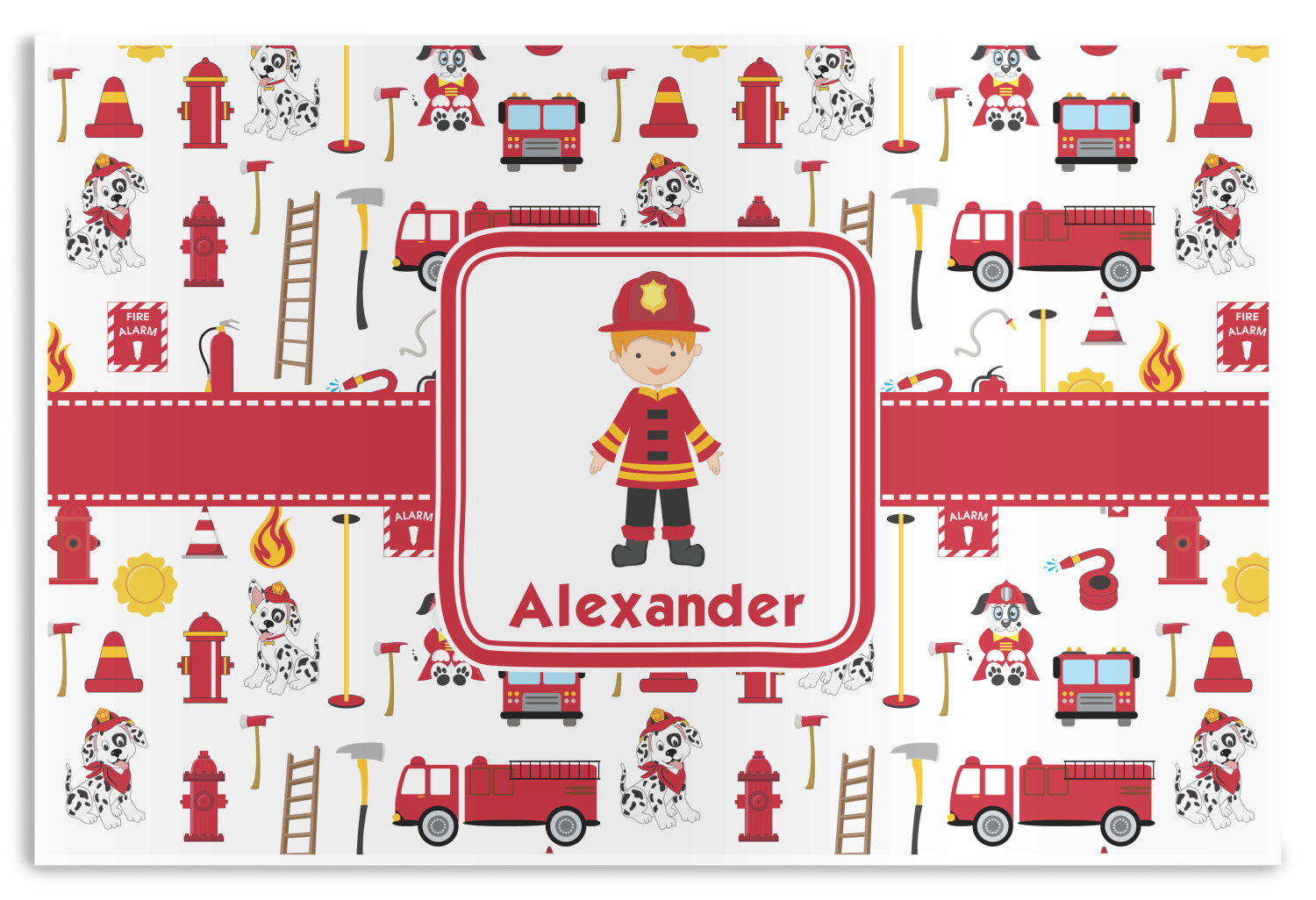 What little boy doesn't dream about growing up and becoming a firefighter? Open his imagination with this adorable design showing your little man ready to save some lives with a whole fleet of fire trucks, fire hydrants, ladders, and poles behind him.