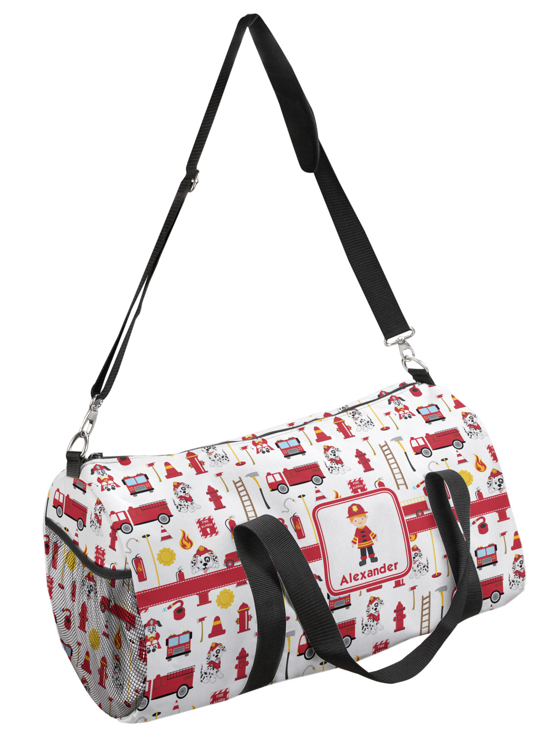 This duffle is a sturdy bag made of a canvas material. It comes in two sizes: Small (19"W x 9.5"H x 9.5"D) and Large (23"W x 12"H x 12"D). The bag is a cylindrical shape with a black adjustable strap and two handles. On one side is an elastic pouch to put a waterbottle or other small item. Your product will be sublimated with your design and is able to be designed on the front, back, and sides. Be sure to remember that the straps may cut into parts of your design if you upload your own artwork.
