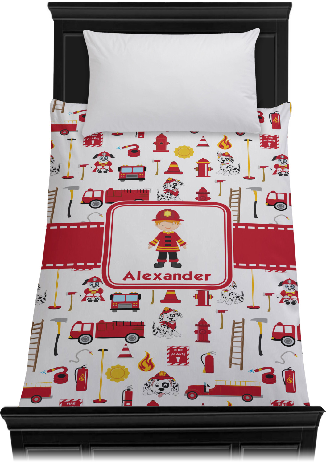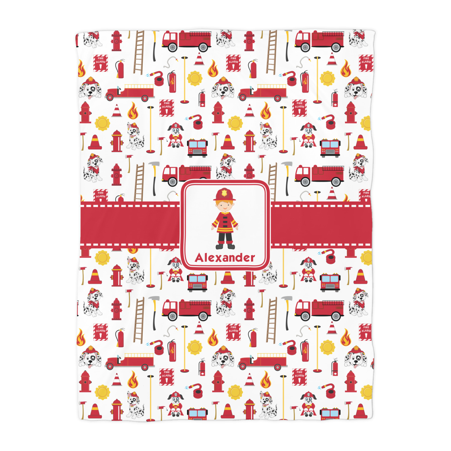What little boy doesn't dream about growing up and becoming a firefighter? Open his imagination with this adorable design showing your little man ready to save some lives with a whole fleet of fire trucks, fire hydrants, ladders, and poles behind him.