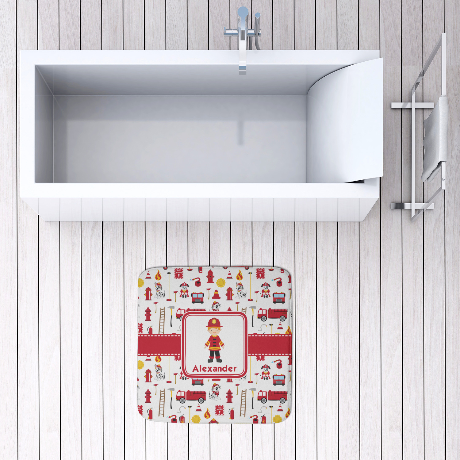 We offer this custom bath mat in four different sizes, so that you can choose the proper size for your bathroom and shower space. We suggest measuring the area before so that you can make an informed purchase. The four sizes are as follows: 24 by 17 inches, 34 by 21 inches, 48 by 36 inches, and 48 by 48 inches.