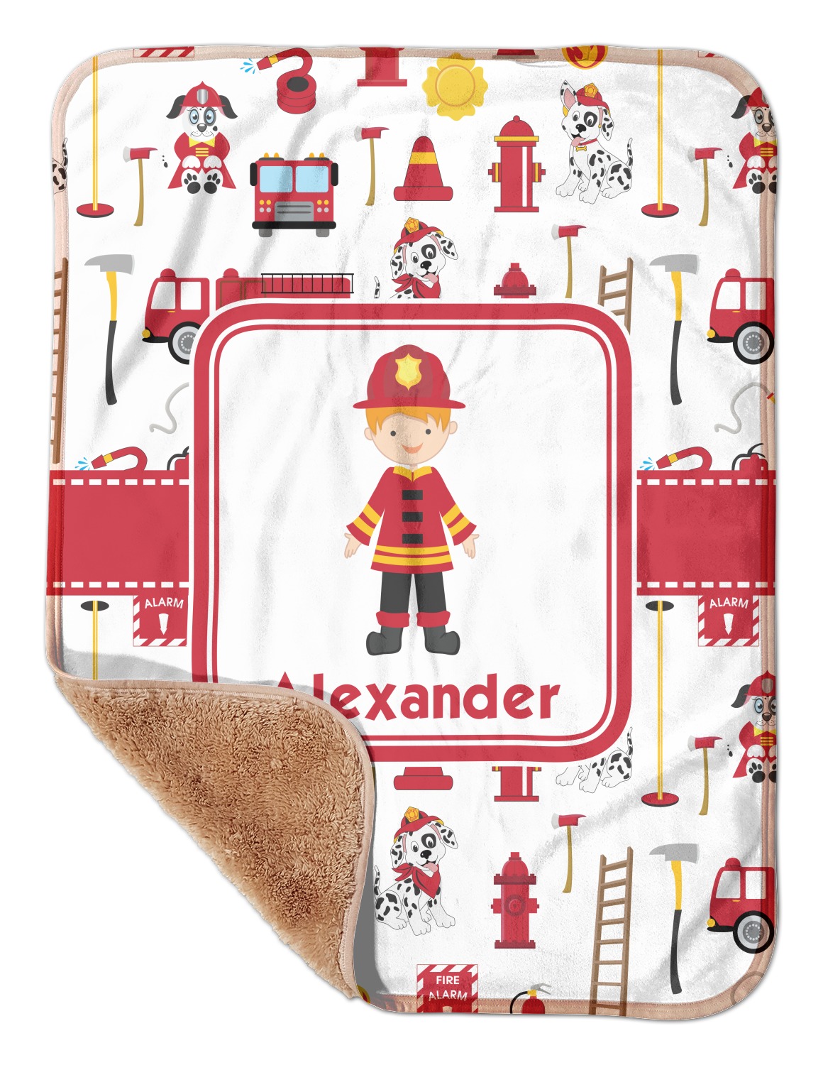 What little boy doesn't dream about growing up and becoming a firefighter? Open his imagination with this adorable design showing your little man ready to save some lives with a whole fleet of fire trucks, fire hydrants, ladders, and poles behind him.