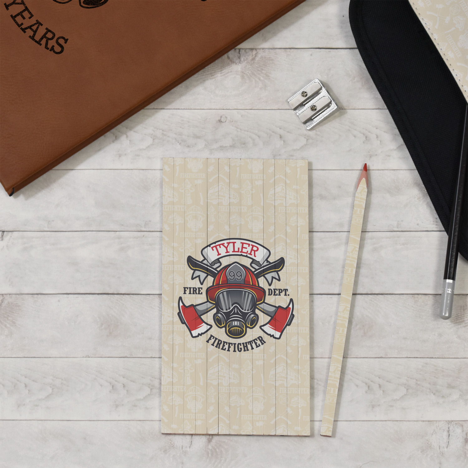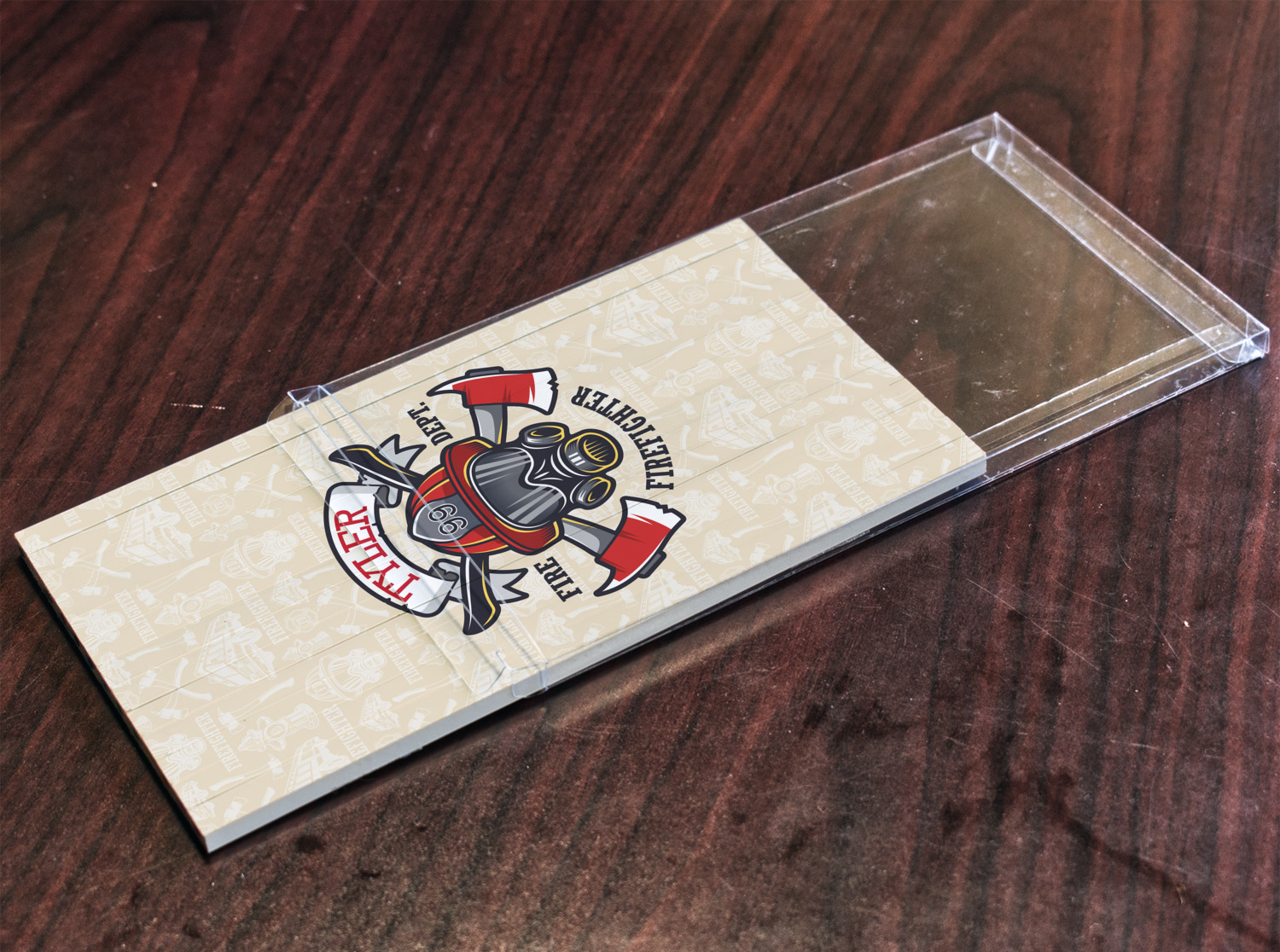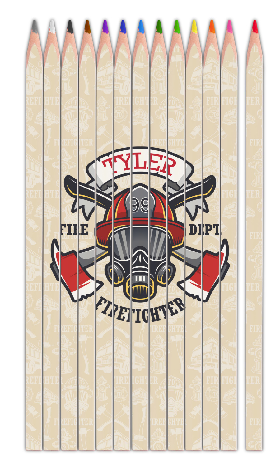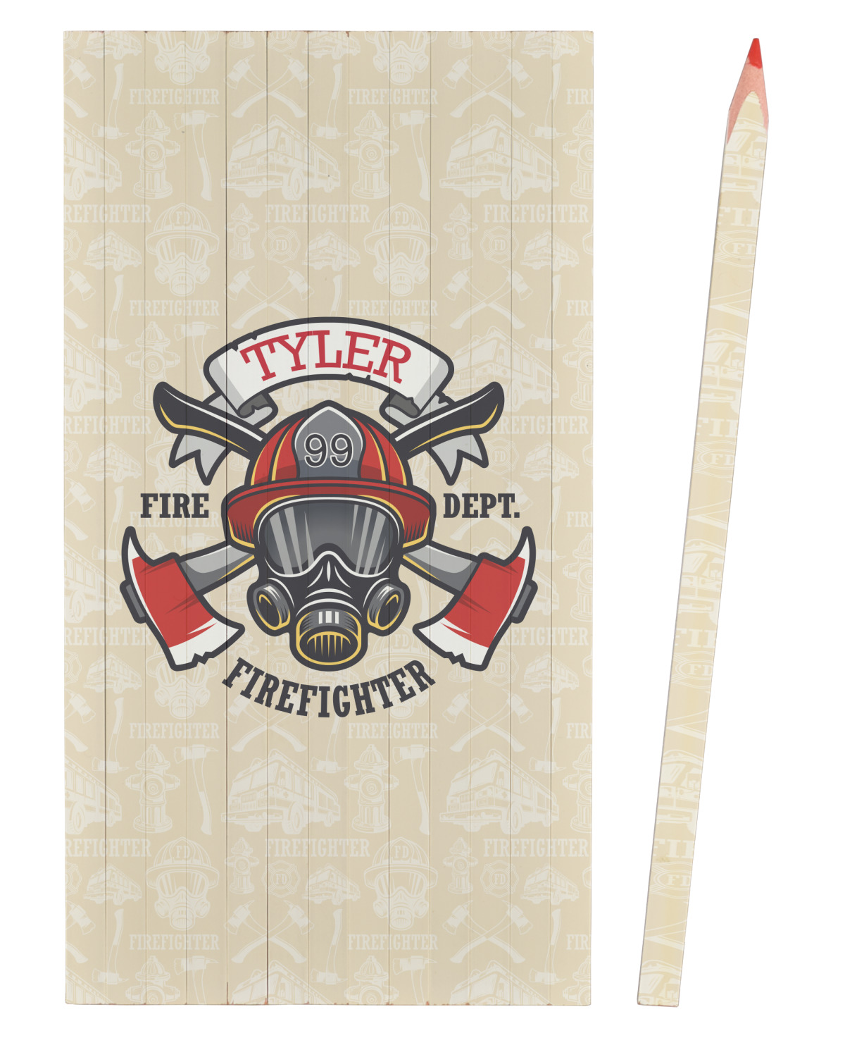 This design features a beautiful illustration of a firefighter's gear with axes. The top banner is where your personalization goes and underneath it says "Firefighter." The main colors are red and grey. The background is a cream and light cream color and has all kinds of fun firefighter symbols and illustrations. This is the perfect way to say thank you to the firefighter in your life.