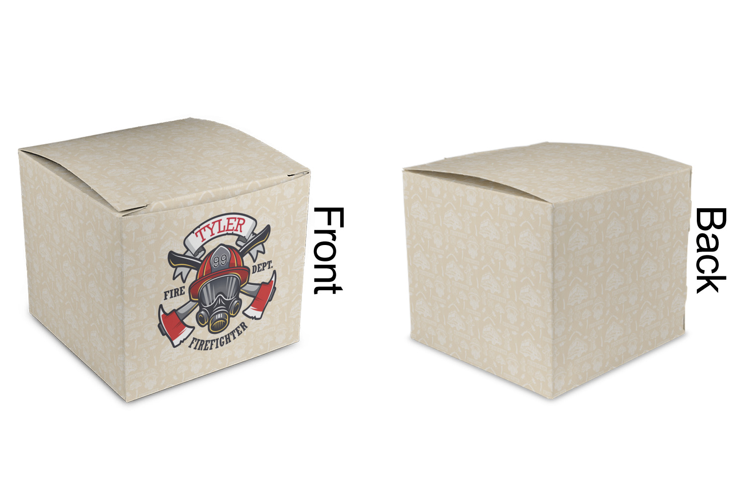 This design features a beautiful illustration of a firefighter's gear with axes. The top banner is where your personalization goes and underneath it says "Firefighter." The main colors are red and grey. The background is a cream and light cream color and has all kinds of fun firefighter symbols and illustrations. This is the perfect way to say thank you to the firefighter in your life.