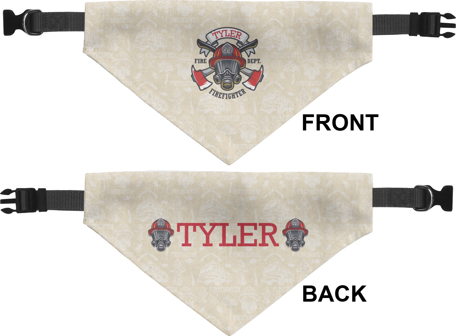 We print the front and back of these dog bandanas with your customized design. The bandana itself is made from a durable polyester, sewn together with a gap large enough to accommodate any collar. Regardless, the bandana includes a plain black, canvas collar with plastic snaps, that can easily be removed if desired. These dog bandana collars are available in four sizes: small, medium, large, and extra large. Please see our sizing chart for more information regarding the dimensions of each size.