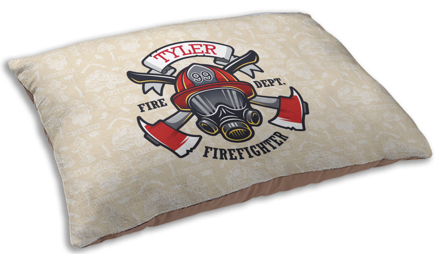 This design features a beautiful illustration of a firefighter's gear with axes. The top banner is where your personalization goes and underneath it says "Firefighter." The main colors are red and grey. The background is a cream and light cream color and has all kinds of fun firefighter symbols and illustrations. This is the perfect way to say thank you to the firefighter in your life.