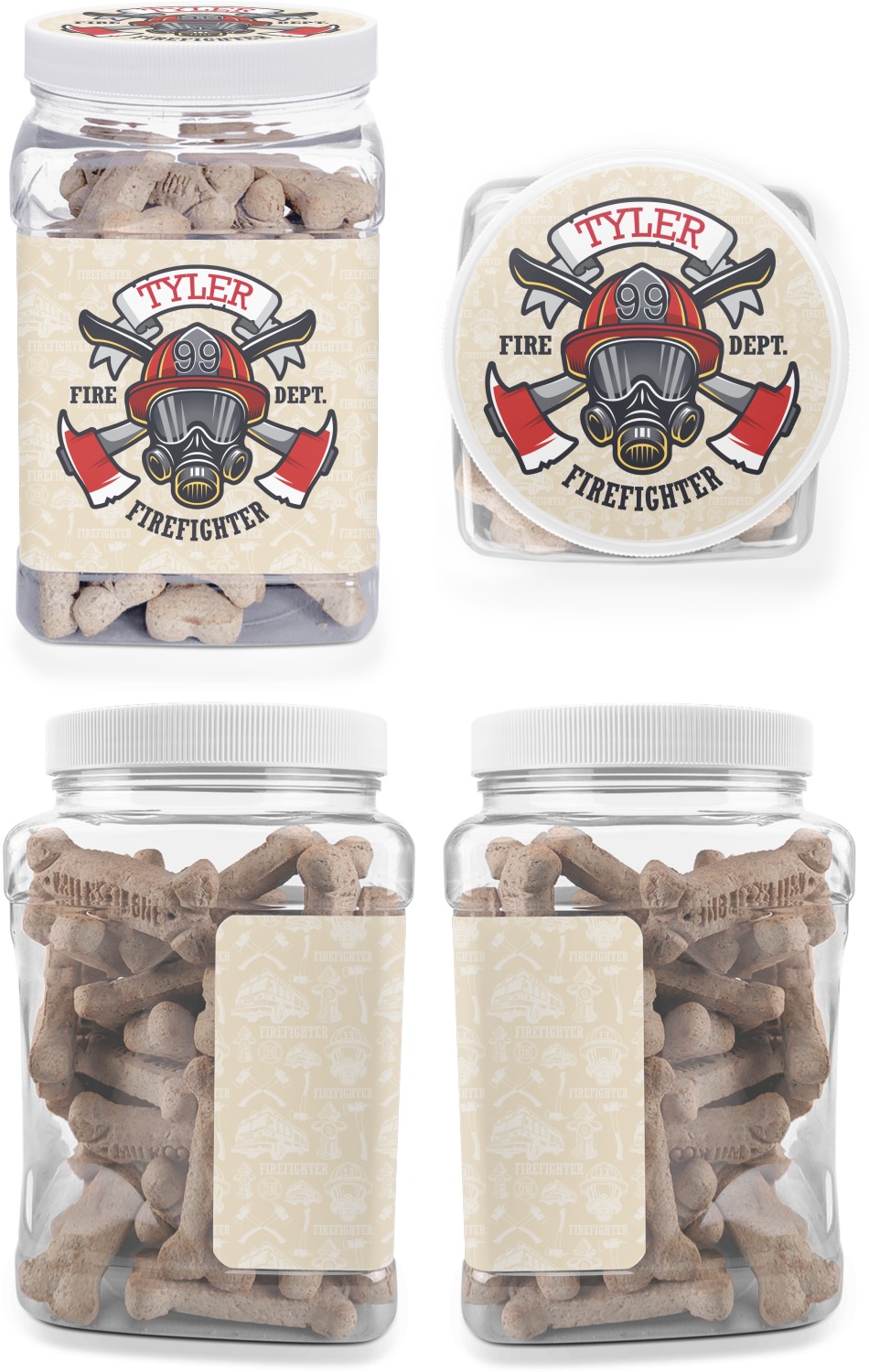 This half gallon jar, made from a sturdy plastic, is the perfect way to keep treats from any naughty pet paws, while still keeping them ready on hand for when your pup performs an impressive trick. This dog cookie jar features a screw-on, white lid that displays your personalized design on a vinyl sticker. We apply another customized sticker that wraps around the front and sides of the jar. Our dog treat jar also has indentations on the rear ends of the sides, which allows for convenient handling, and its square frame allows for easy storage.