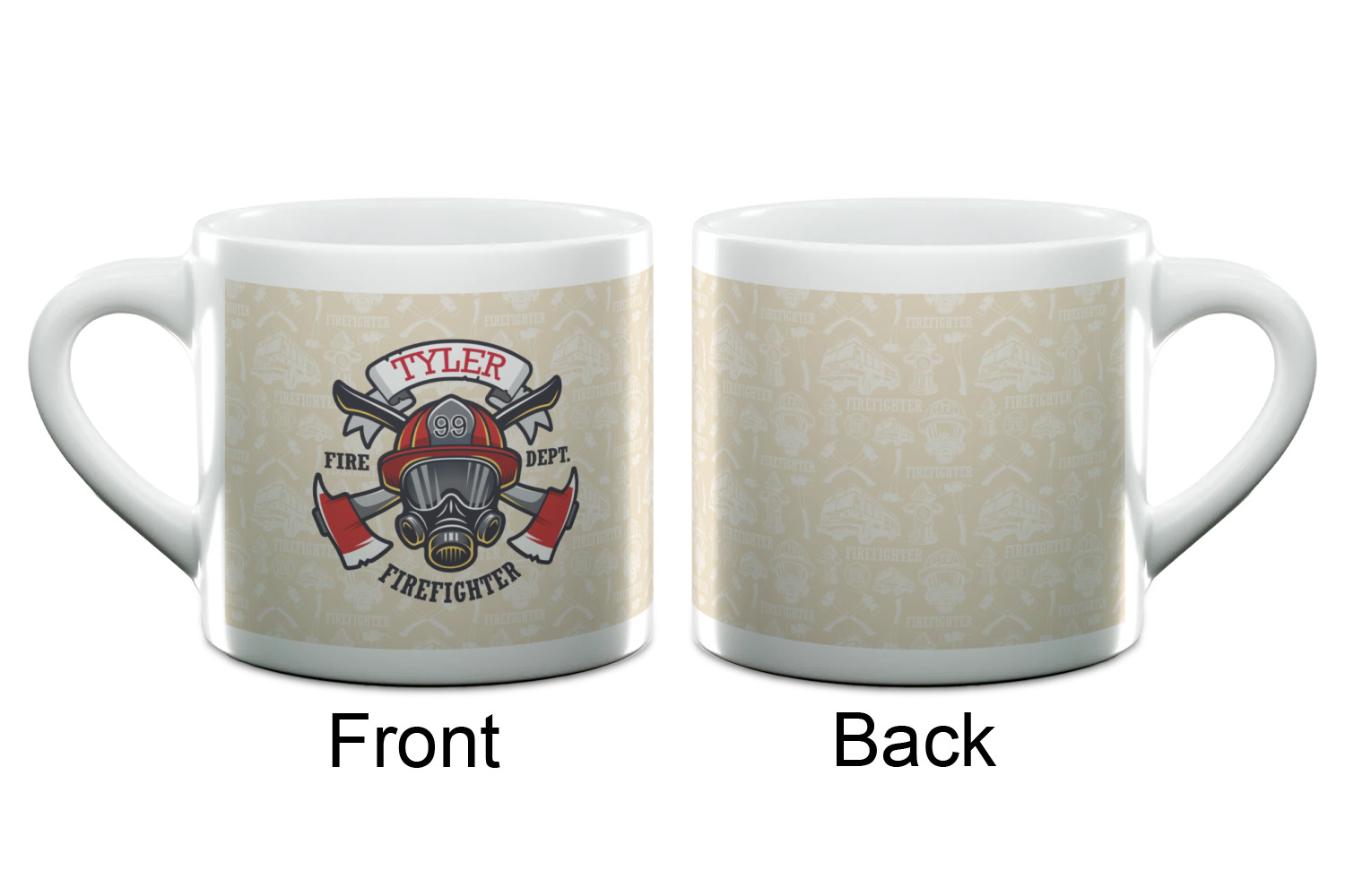 This design features a beautiful illustration of a firefighter's gear with axes. The top banner is where your personalization goes and underneath it says "Firefighter." The main colors are red and grey. The background is a cream and light cream color and has all kinds of fun firefighter symbols and illustrations. This is the perfect way to say thank you to the firefighter in your life.