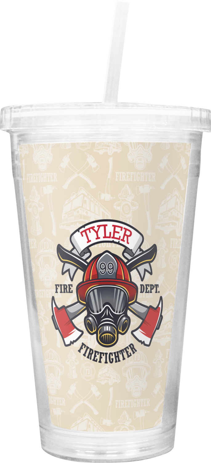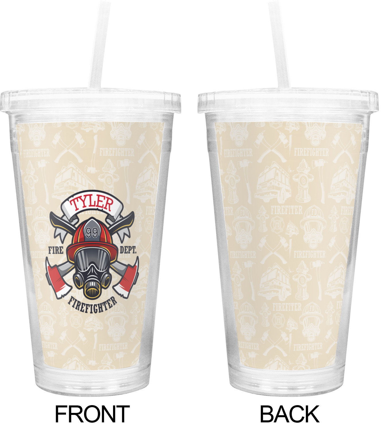 This design features a beautiful illustration of a firefighter's gear with axes. The top banner is where your personalization goes and underneath it says "Firefighter." The main colors are red and grey. The background is a cream and light cream color and has all kinds of fun firefighter symbols and illustrations. This is the perfect way to say thank you to the firefighter in your life.