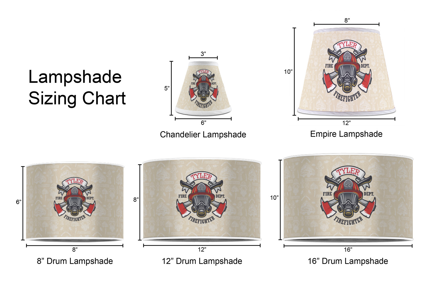 Our customized lamp shades also come in 3 different sizes: 8", 12" and 16", measuring at 8" in diameter by 6" tall, 12" in diameter by 8" tall, and 16" in diameter by 10" tall, respectively.