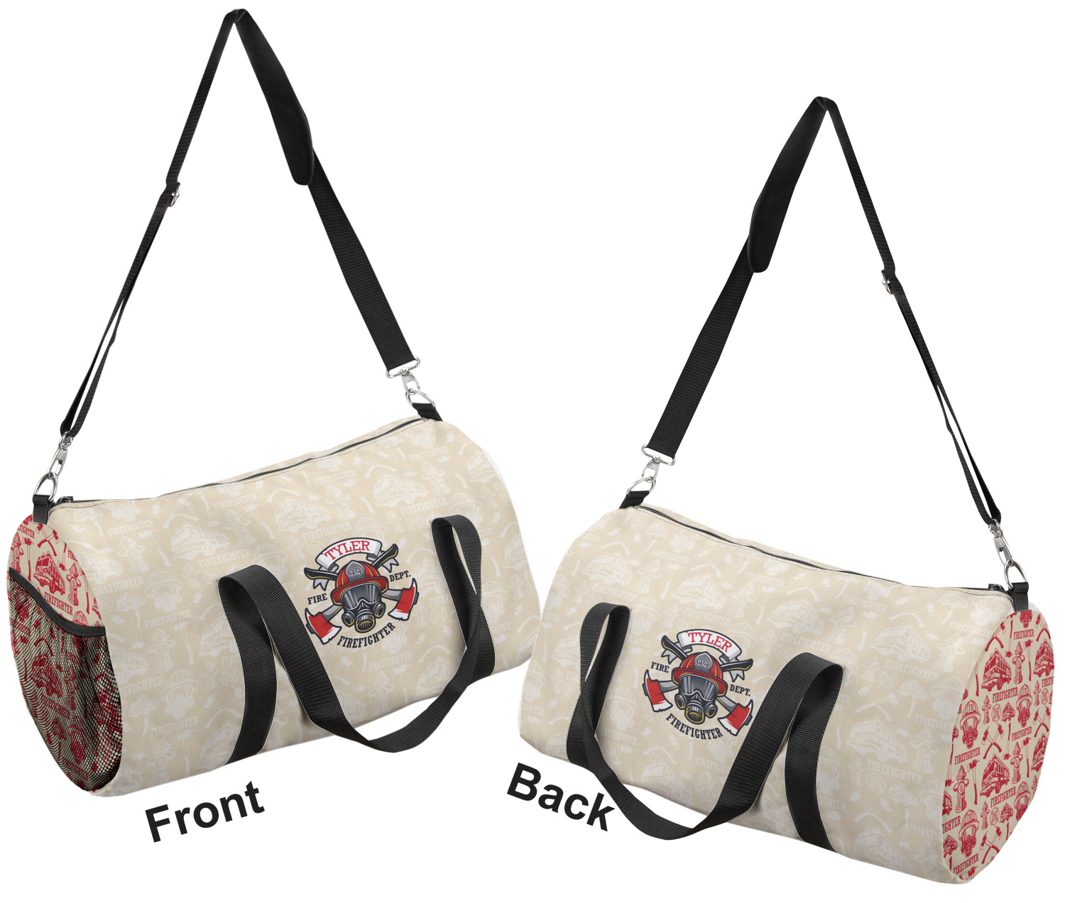 This duffle is a sturdy bag made of a canvas material. It comes in two sizes: Small (19"W x 9.5"H x 9.5"D) and Large (23"W x 12"H x 12"D). The bag is a cylindrical shape with a black adjustable strap and two handles. On one side is an elastic pouch to put a waterbottle or other small item. Your product will be sublimated with your design and is able to be designed on the front, back, and sides. Be sure to remember that the straps may cut into parts of your design if you upload your own artwork.