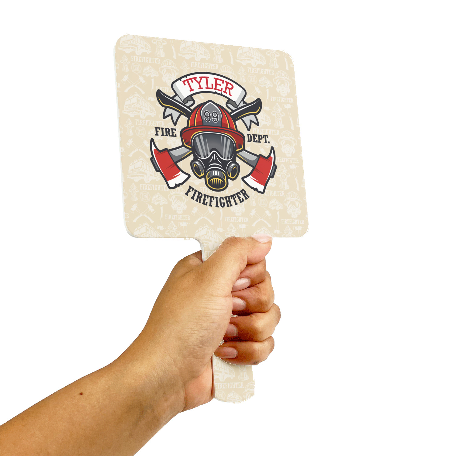 This design features a beautiful illustration of a firefighter's gear with axes. The top banner is where your personalization goes and underneath it says "Firefighter." The main colors are red and grey. The background is a cream and light cream color and has all kinds of fun firefighter symbols and illustrations. This is the perfect way to say thank you to the firefighter in your life.