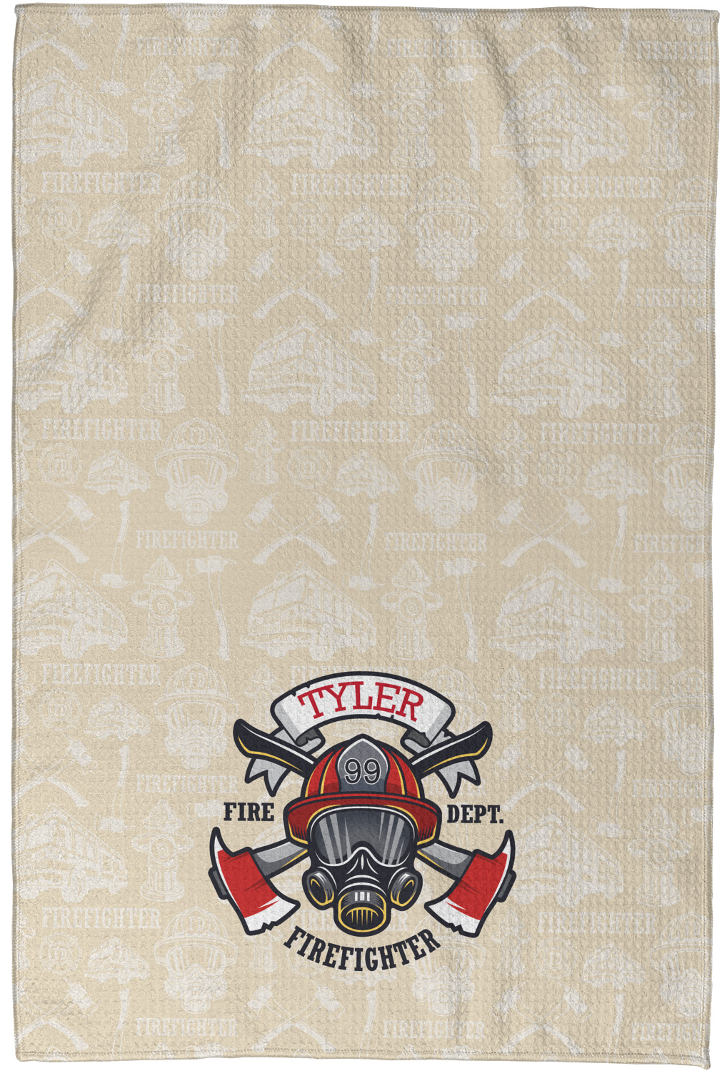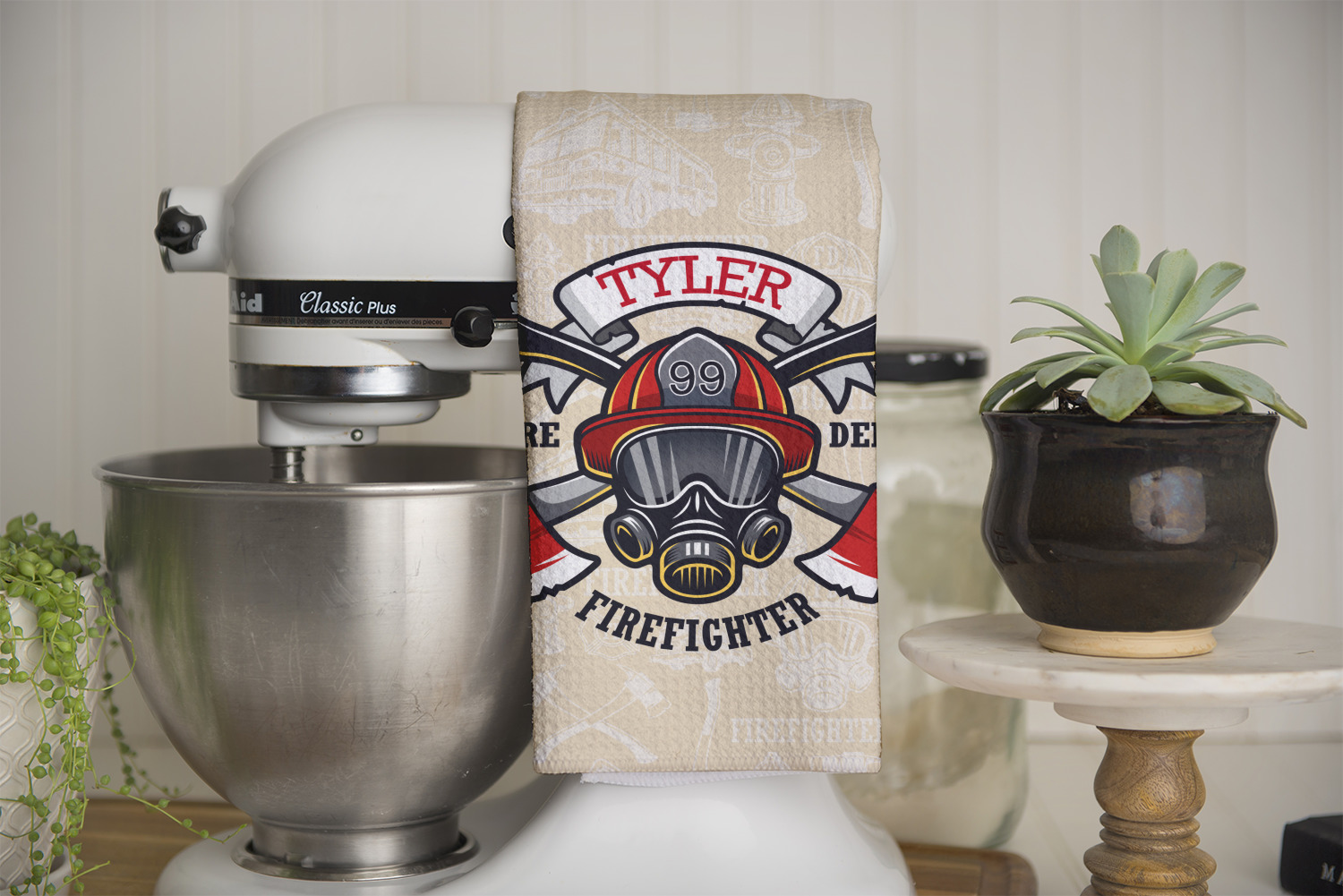 This design features a beautiful illustration of a firefighter's gear with axes. The top banner is where your personalization goes and underneath it says "Firefighter." The main colors are red and grey. The background is a cream and light cream color and has all kinds of fun firefighter symbols and illustrations. This is the perfect way to say thank you to the firefighter in your life.