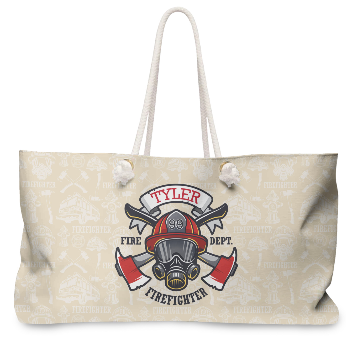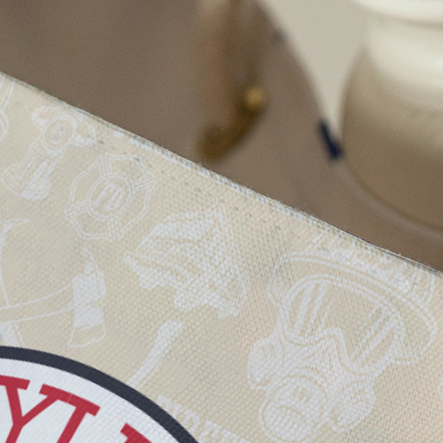 This design features a beautiful illustration of a firefighter's gear with axes. The top banner is where your personalization goes and underneath it says "Firefighter." The main colors are red and grey. The background is a cream and light cream color and has all kinds of fun firefighter symbols and illustrations. This is the perfect way to say thank you to the firefighter in your life.