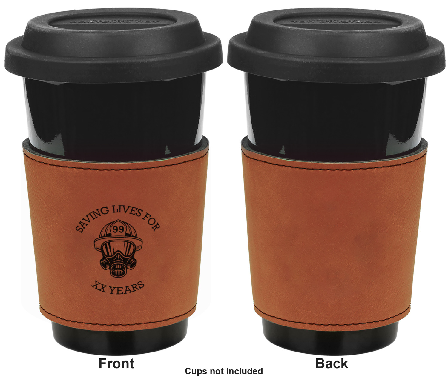 This cup sleeve is made from a suave, cognac-brown leatherette and finished with an intricate, black stitch. The interior of this can sleeve is fabricated from a thin foam material to help insulate your mug's contents. The sleeve is specifically made to suit tapered glasses or mugs, so the top's diameter is 3.5 inches, while the bottom's diameter is 2.75 inches. Your customized design will be laser engraved into the leatherette, leaving behind crisp, black imprint. With these products, we provide you with the option of engraving the front and back, or the front only.