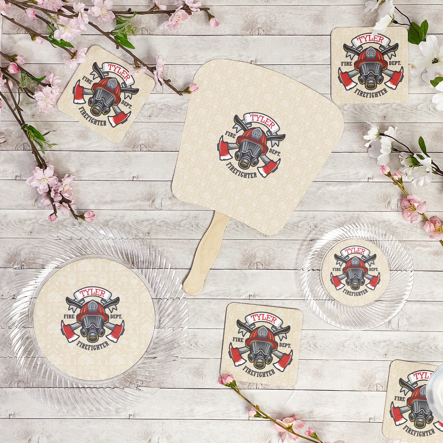 This design features a beautiful illustration of a firefighter's gear with axes. The top banner is where your personalization goes and underneath it says "Firefighter." The main colors are red and grey. The background is a cream and light cream color and has all kinds of fun firefighter symbols and illustrations. This is the perfect way to say thank you to the firefighter in your life.