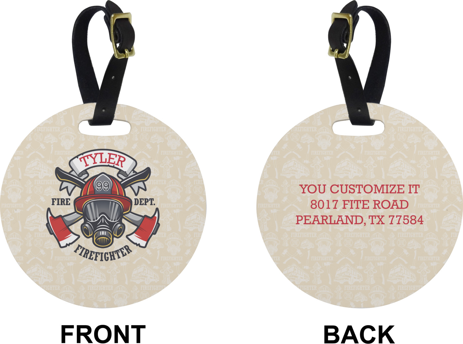 These personalized bag tags are sold in a variety of shapes, so that you may find the product that meets your vision exactly. We sell a round luggage tag, which measures at approximately 4" x 4". Our square luggage tag is about 3.5" x 3.5", while our rectangular version is 2.75" x 4 ".