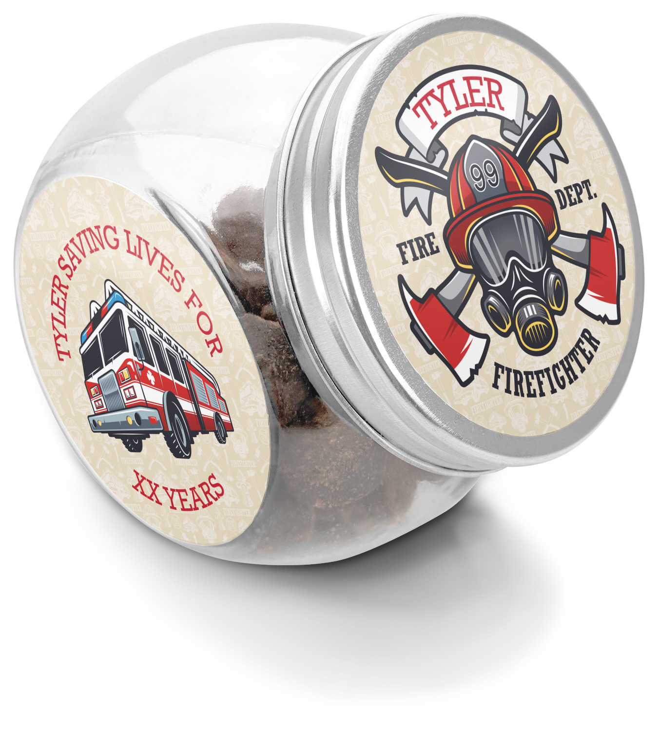 This design features a beautiful illustration of a firefighter's gear with axes. The top banner is where your personalization goes and underneath it says "Firefighter." The main colors are red and grey. The background is a cream and light cream color and has all kinds of fun firefighter symbols and illustrations. This is the perfect way to say thank you to the firefighter in your life.