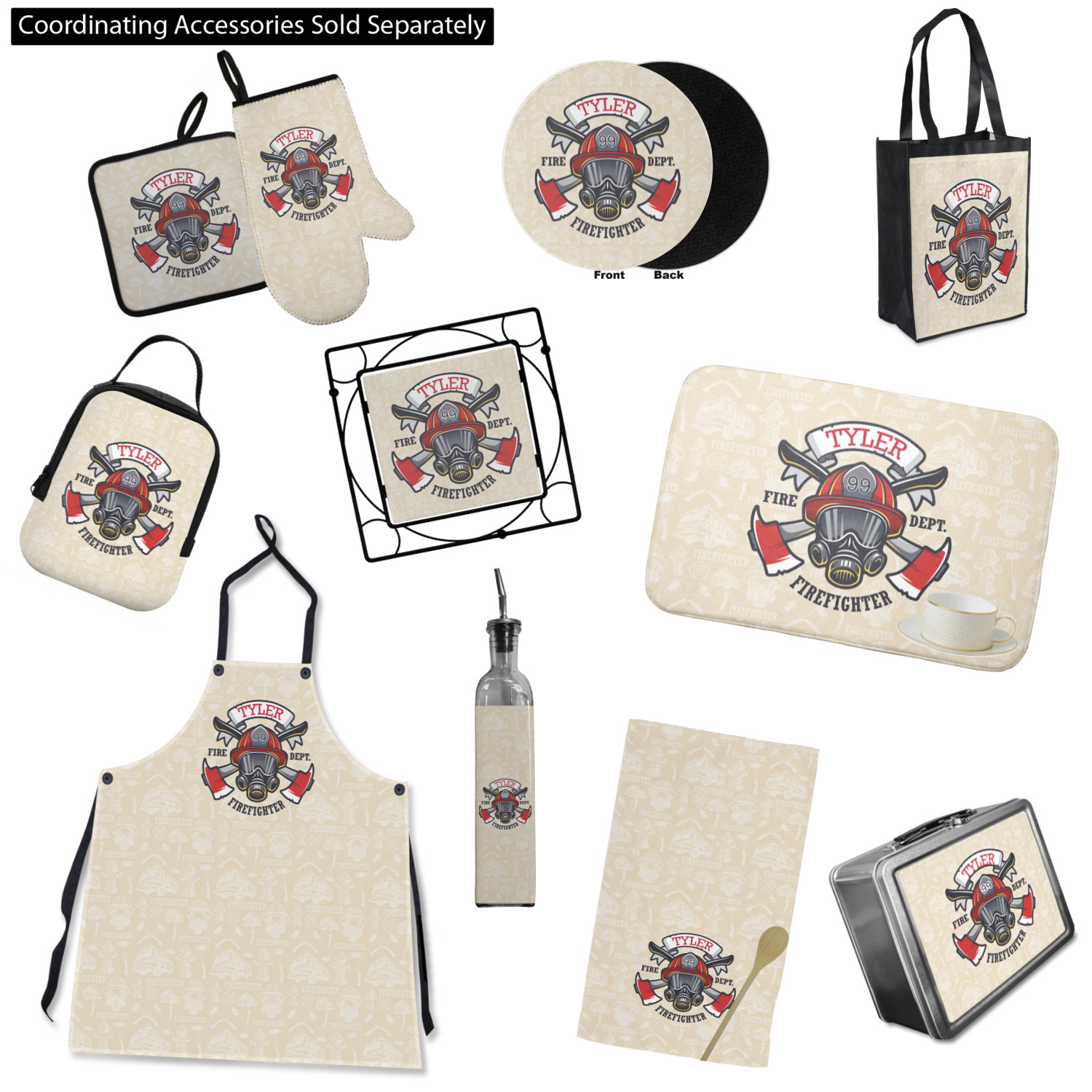 This design features a beautiful illustration of a firefighter's gear with axes. The top banner is where your personalization goes and underneath it says "Firefighter." The main colors are red and grey. The background is a cream and light cream color and has all kinds of fun firefighter symbols and illustrations. This is the perfect way to say thank you to the firefighter in your life.