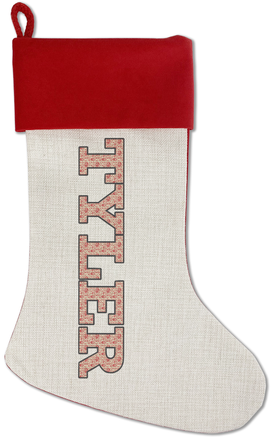 Our classic red stockings are made from a soft, yet durable polyester material perfect for any stocking stuffer! The front of our Christmas stockings have a linen front that boldly displays your custom design accented with a lush red cuff resting all around the stocking. Each stocking is approximately 18x12 with a durable cotton rope loop for hanging.