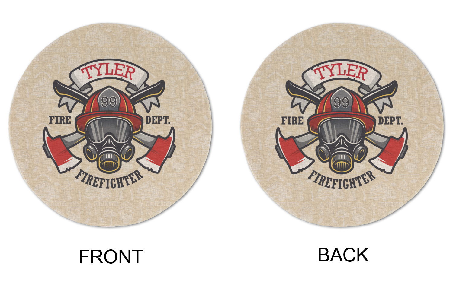This design features a beautiful illustration of a firefighter's gear with axes. The top banner is where your personalization goes and underneath it says "Firefighter." The main colors are red and grey. The background is a cream and light cream color and has all kinds of fun firefighter symbols and illustrations. This is the perfect way to say thank you to the firefighter in your life.
