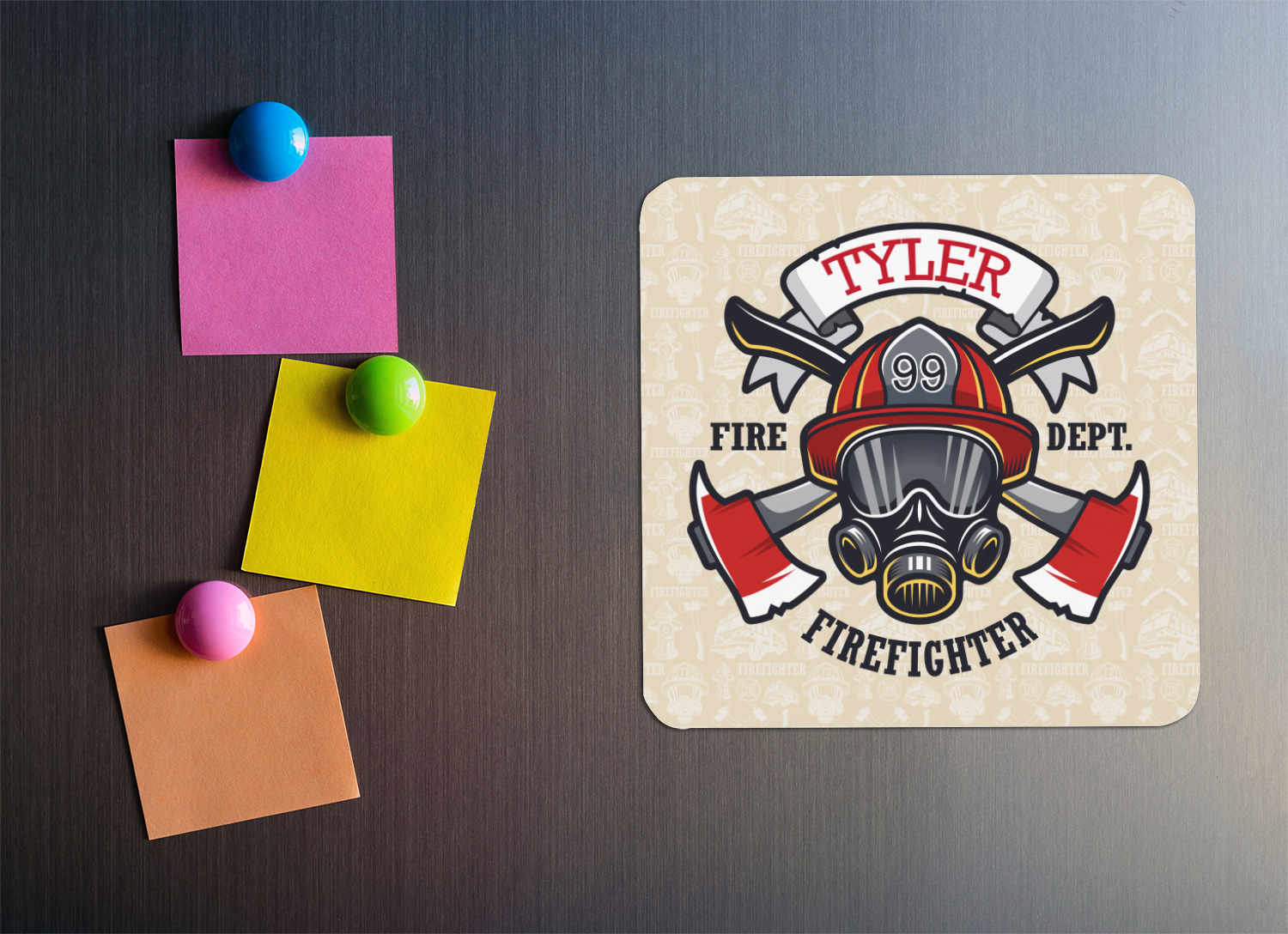 This design features a beautiful illustration of a firefighter's gear with axes. The top banner is where your personalization goes and underneath it says "Firefighter." The main colors are red and grey. The background is a cream and light cream color and has all kinds of fun firefighter symbols and illustrations. This is the perfect way to say thank you to the firefighter in your life.