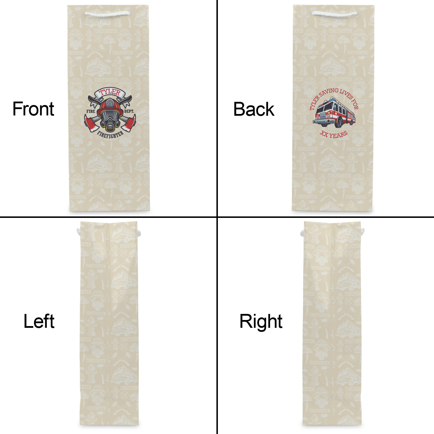 This design features a beautiful illustration of a firefighter's gear with axes. The top banner is where your personalization goes and underneath it says "Firefighter." The main colors are red and grey. The background is a cream and light cream color and has all kinds of fun firefighter symbols and illustrations. This is the perfect way to say thank you to the firefighter in your life.