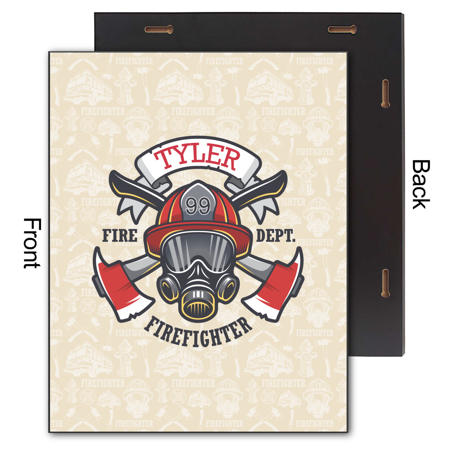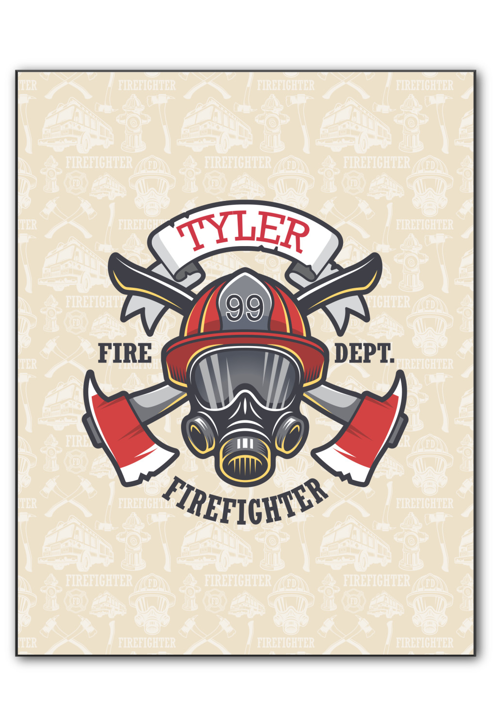 This design features a beautiful illustration of a firefighter's gear with axes. The top banner is where your personalization goes and underneath it says "Firefighter." The main colors are red and grey. The background is a cream and light cream color and has all kinds of fun firefighter symbols and illustrations. This is the perfect way to say thank you to the firefighter in your life.