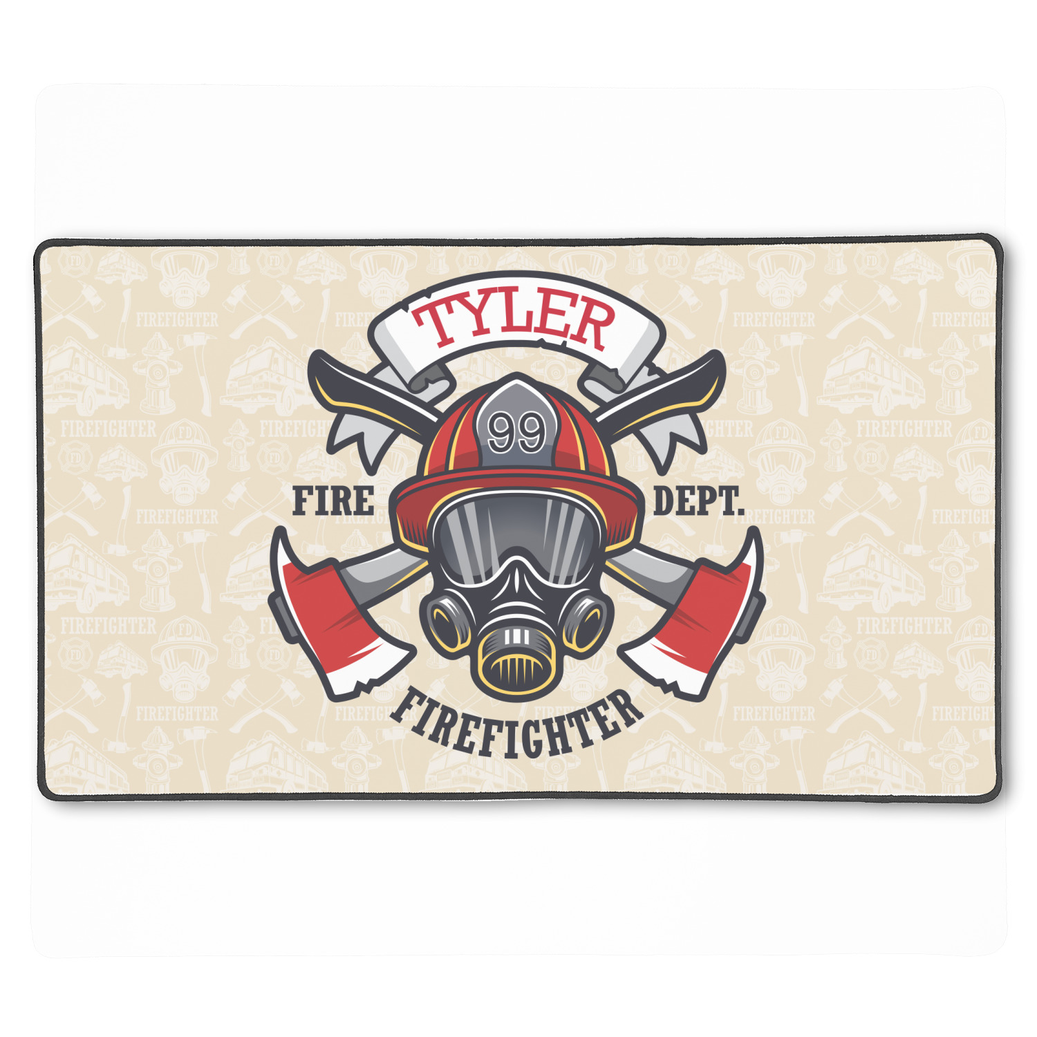 This design features a beautiful illustration of a firefighter's gear with axes. The top banner is where your personalization goes and underneath it says "Firefighter." The main colors are red and grey. The background is a cream and light cream color and has all kinds of fun firefighter symbols and illustrations. This is the perfect way to say thank you to the firefighter in your life.