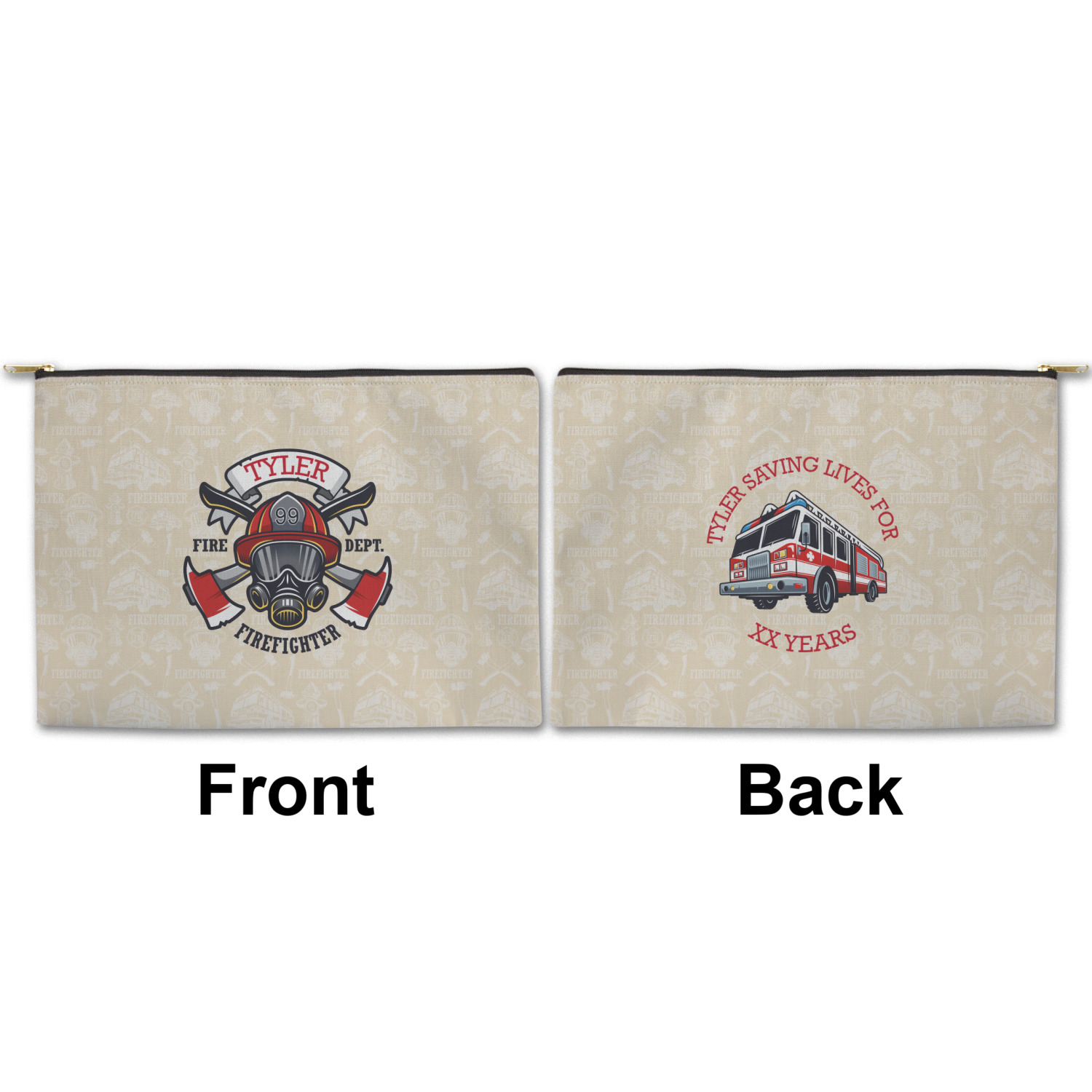 This design features a beautiful illustration of a firefighter's gear with axes. The top banner is where your personalization goes and underneath it says "Firefighter." The main colors are red and grey. The background is a cream and light cream color and has all kinds of fun firefighter symbols and illustrations. This is the perfect way to say thank you to the firefighter in your life.