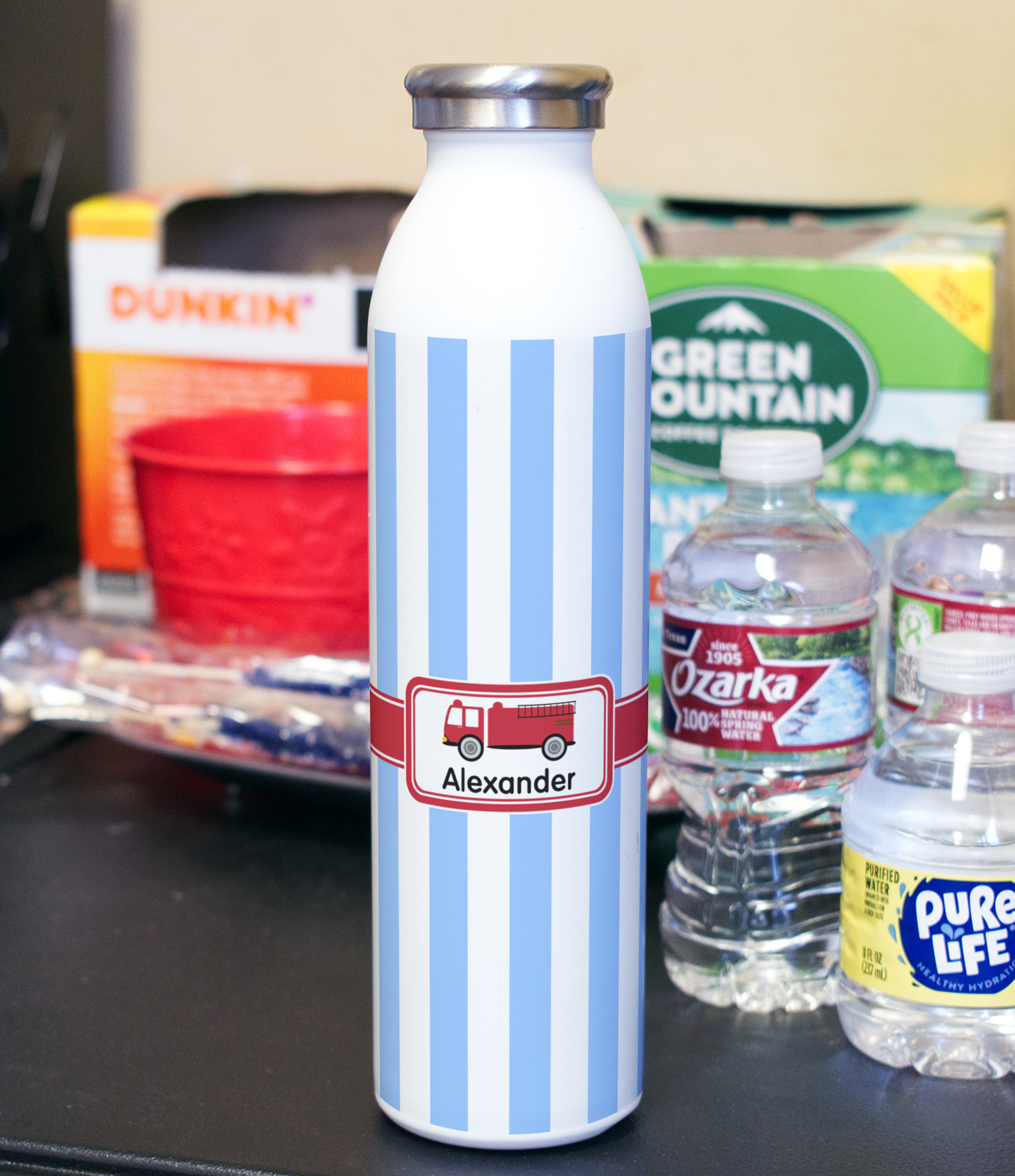 What little boy doesn't dream about growing up and becoming a fire fighter? Set on a classic striped blue and white background, this design featuring a snazzy firetruck is perfect for your little fireman-to-be.