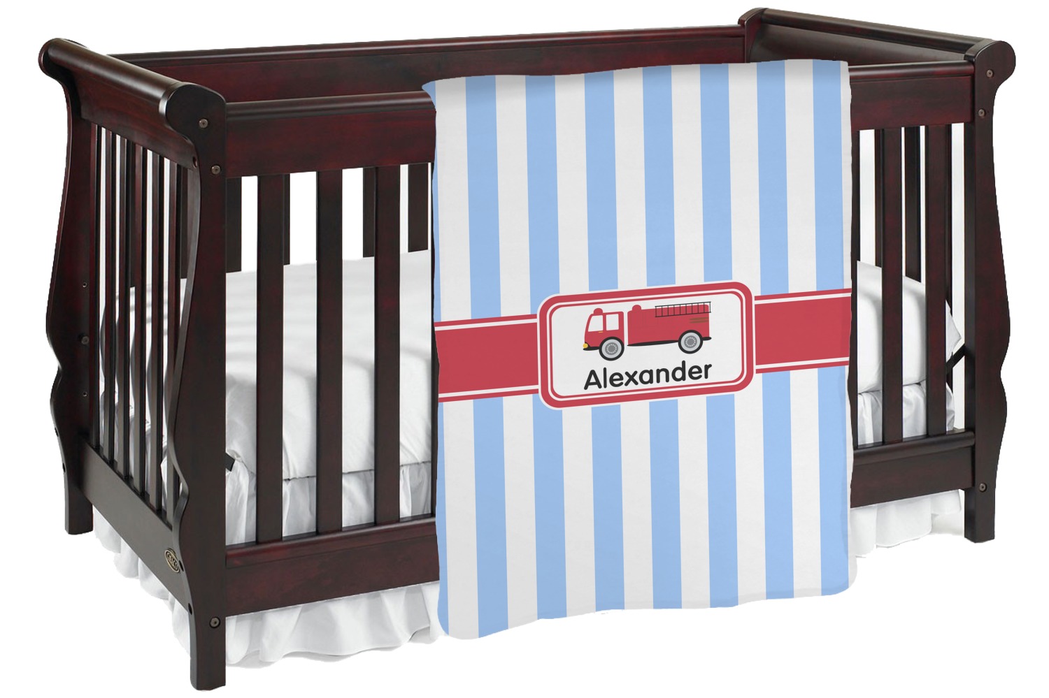 What little boy doesn't dream about growing up and becoming a fire fighter? Set on a classic striped blue and white background, this design featuring a snazzy firetruck is perfect for your little fireman-to-be.