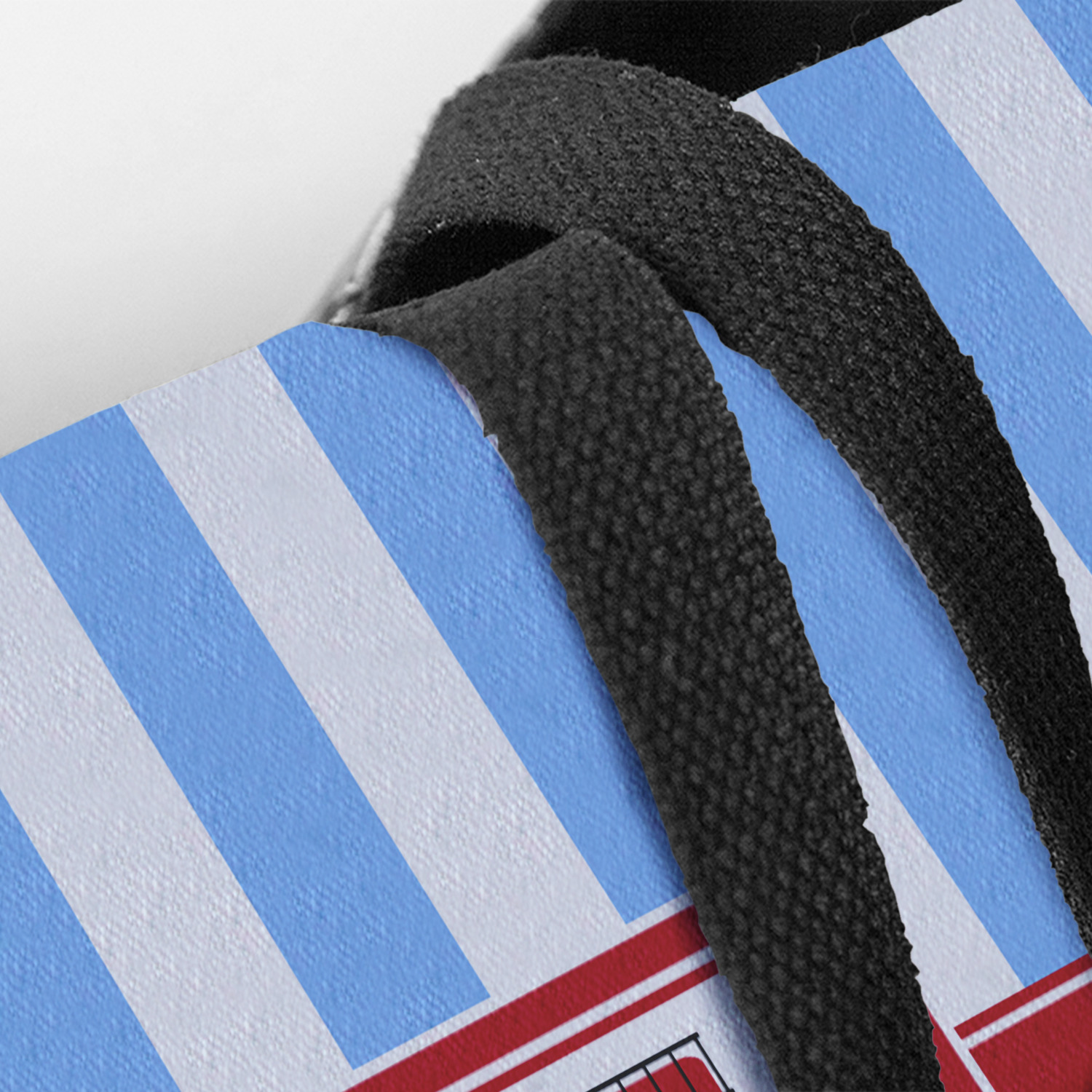 The totes are made from a sturdy canvas material on the outside and are lined with a black poly cotton lining. The beach totes have an approx. 28" black woven handles.