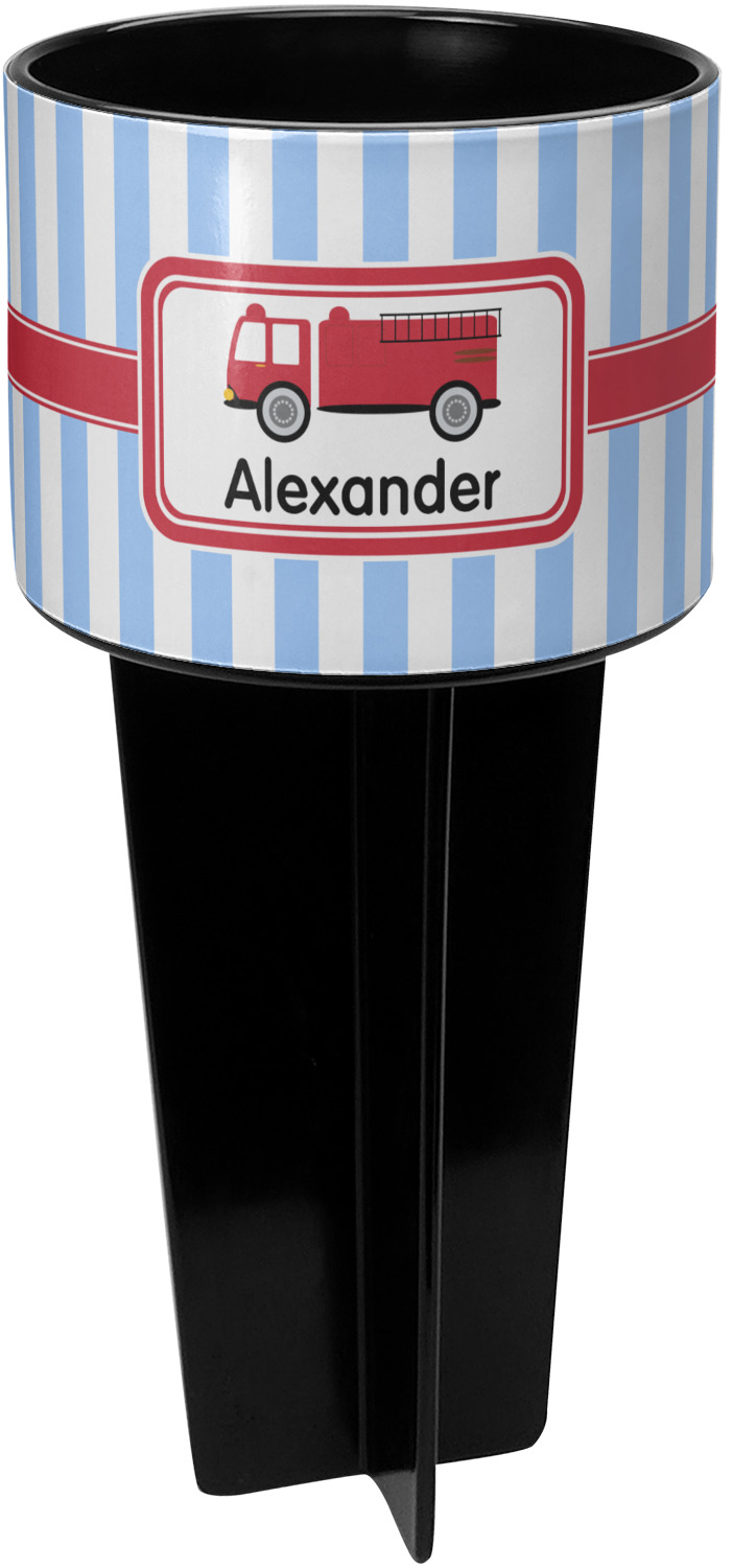 This cup holder has a large stake at its bottom that anchors it to the sand or ground below, while the cup holder rests above the stake. The entire drink holder is made of durable plastic and displays your customization around the cup holder portion. We sell these personalized beach spikers in two different colors: black and white.