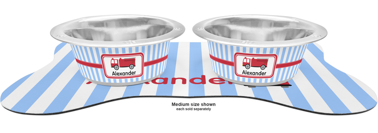 The top of this mat displays your custom design, as it is printed on polyester. To prevent slippage, the underside of the mat is made of rubber. We offer a small dog food mat, suitable for smaller dogs and a large dog food mat for bigger breeds. The small dog food mat is approximately 19 by 13 inches, while the large dog feeding mat measures at approximately 26.75 by 18 inches. Both personalized mats are ideally sized to fit two dog bowls.