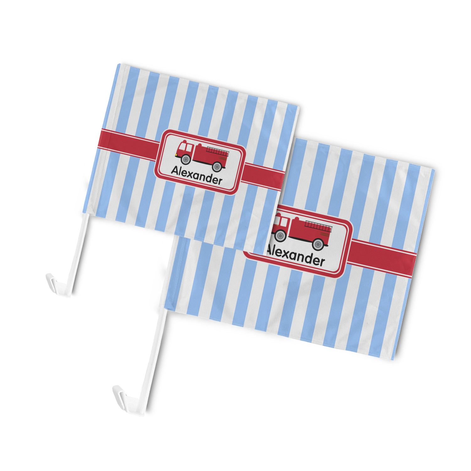 Our personalized flags are made from a durable, yet lightweight cloth that will proudly bear your logo or design of choice, while withstanding the outside elements. We have two size options - 8" x 11" and 11" x 15". Both come with a flag pole which includes a clip that secures the pole to the side window, whether it is rolled up or down. The flags are printed on both sides to display your design from all directions.