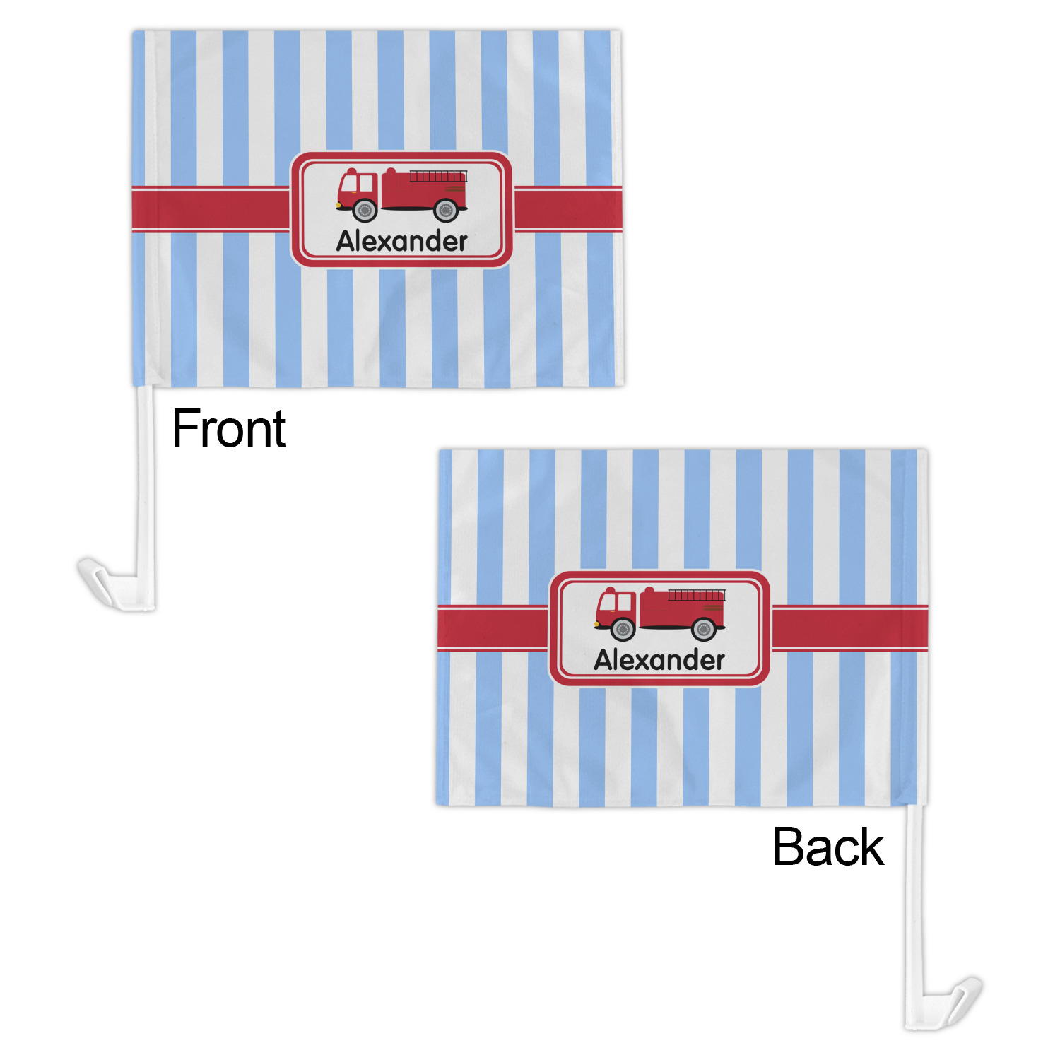 Our personalized flags are made from a durable, yet lightweight cloth that will proudly bear your logo or design of choice, while withstanding the outside elements. We have two size options - 8" x 11" and 11" x 15". Both come with a flag pole which includes a clip that secures the pole to the side window, whether it is rolled up or down. The flags are printed on both sides to display your design from all directions.