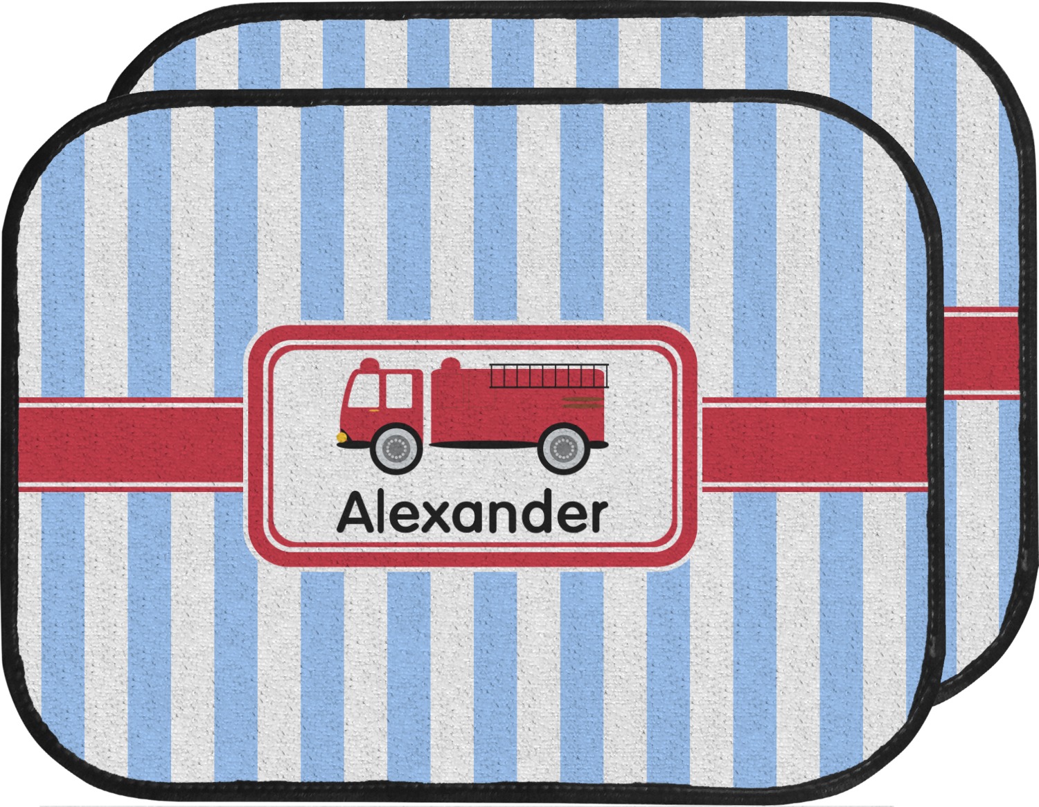What little boy doesn't dream about growing up and becoming a fire fighter? Set on a classic striped blue and white background, this design featuring a snazzy firetruck is perfect for your little fireman-to-be.