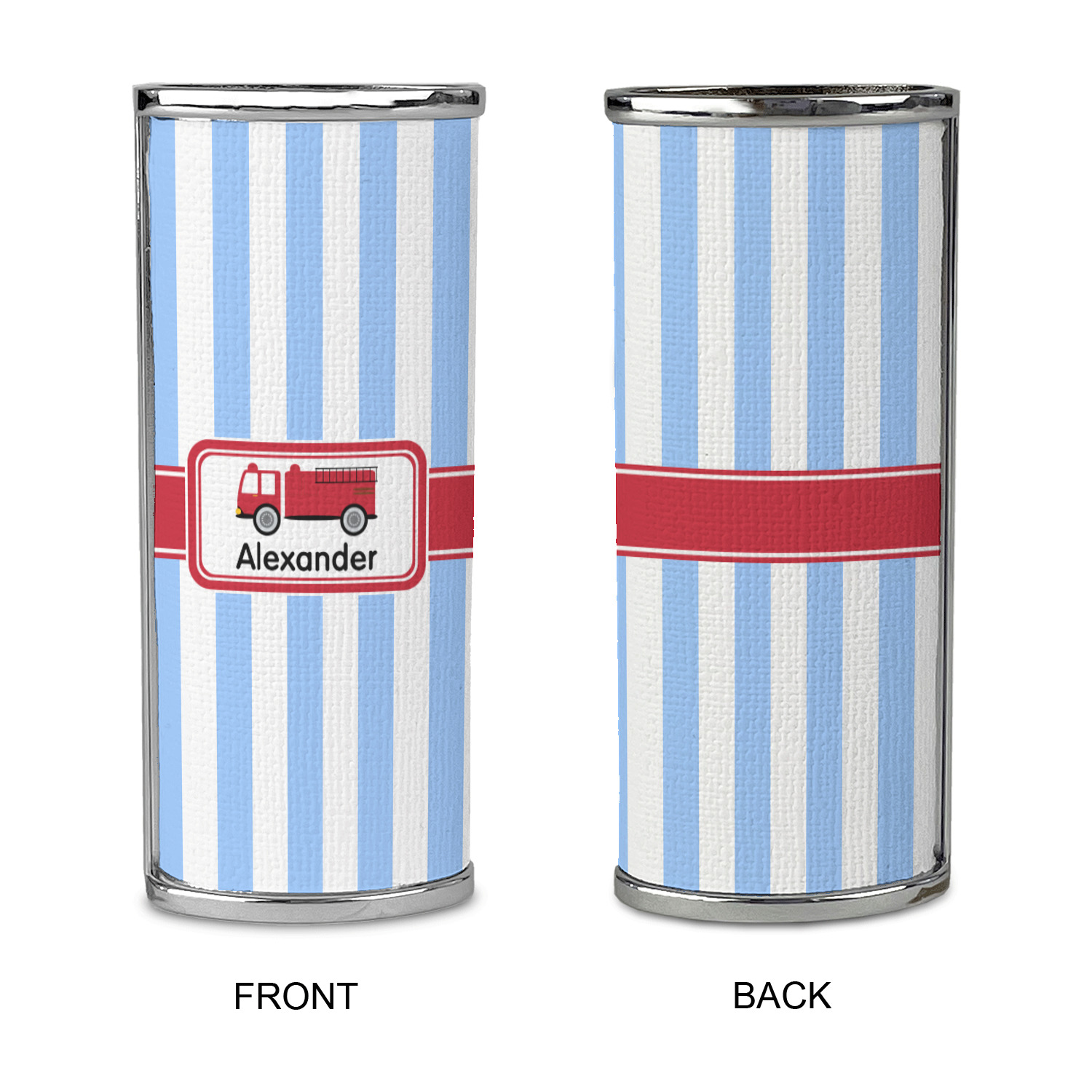 What little boy doesn't dream about growing up and becoming a fire fighter? Set on a classic striped blue and white background, this design featuring a snazzy firetruck is perfect for your little fireman-to-be.
