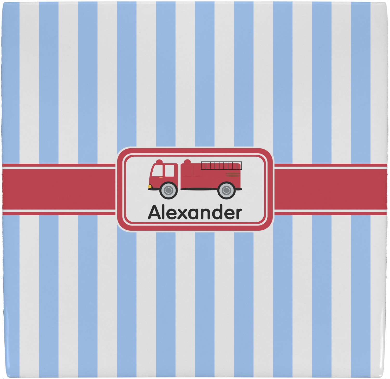 What little boy doesn't dream about growing up and becoming a fire fighter? Set on a classic striped blue and white background, this design featuring a snazzy firetruck is perfect for your little fireman-to-be.