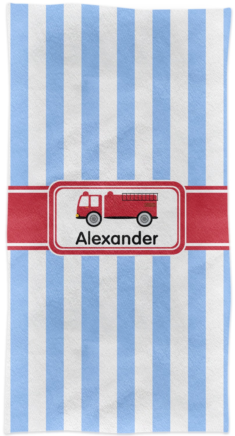 What little boy doesn't dream about growing up and becoming a fire fighter? Set on a classic striped blue and white background, this design featuring a snazzy firetruck is perfect for your little fireman-to-be.