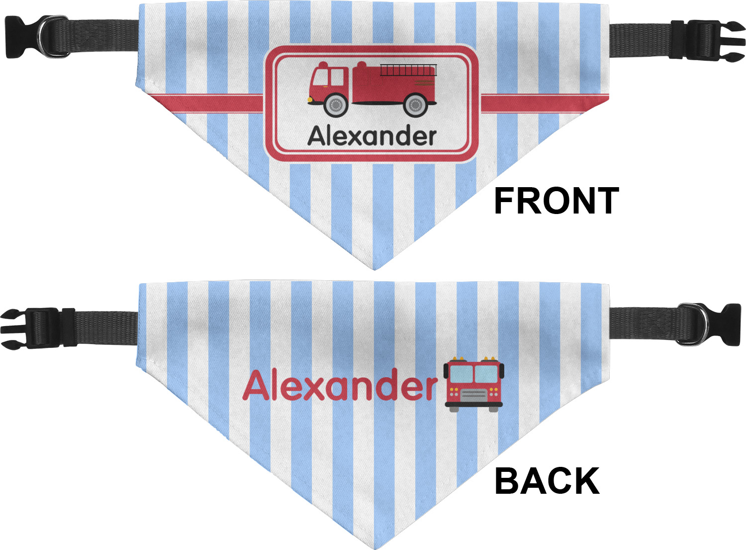 We print the front and back of these dog bandanas with your customized design. The bandana itself is made from a durable polyester, sewn together with a gap large enough to accommodate any collar. Regardless, the bandana includes a plain black, canvas collar with plastic snaps, that can easily be removed if desired. These dog bandana collars are available in four sizes: small, medium, large, and extra large. Please see our sizing chart for more information regarding the dimensions of each size.