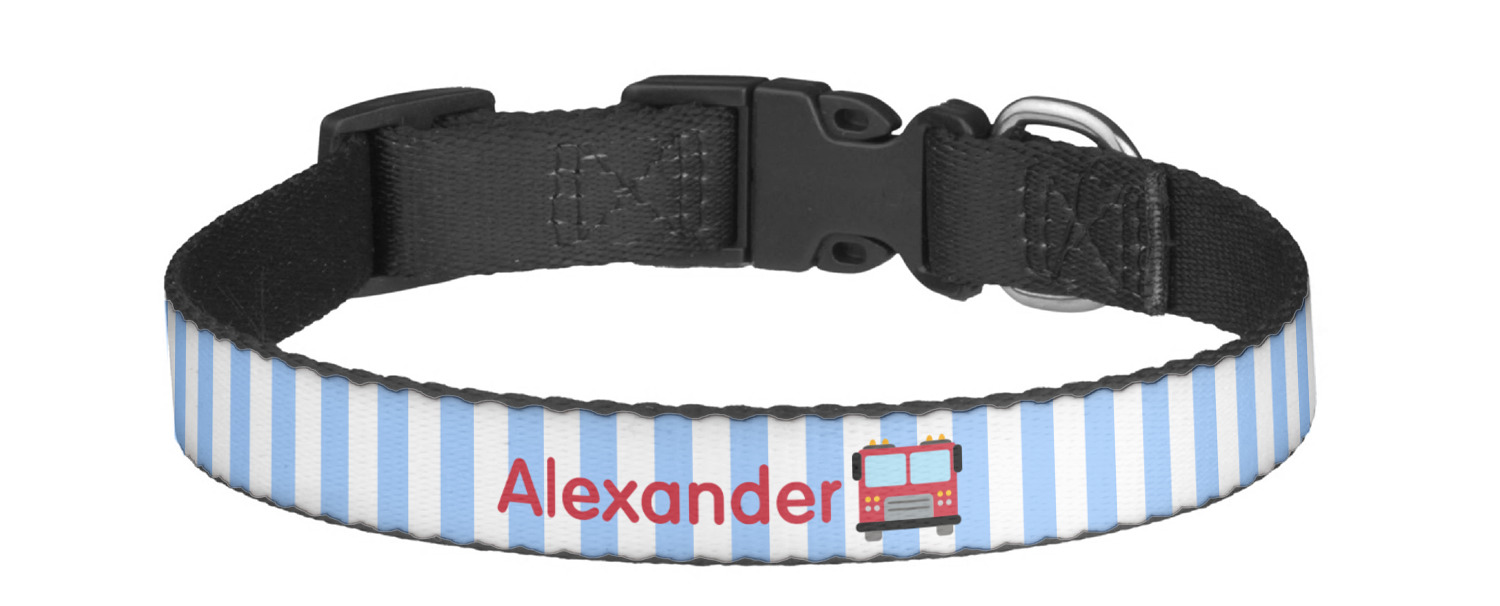 We offer these custom dog collars in two sizes: small and large. Our small dog collar, suitable for Pugs, Corgis, Beagles, and many others, is 10" to 16" long and 0.75" wide. Our large size fits Collies, Labradors, and Standard Poodles and other larger dogs (to name a few), and is 15" to 22" long, and 1" wide.