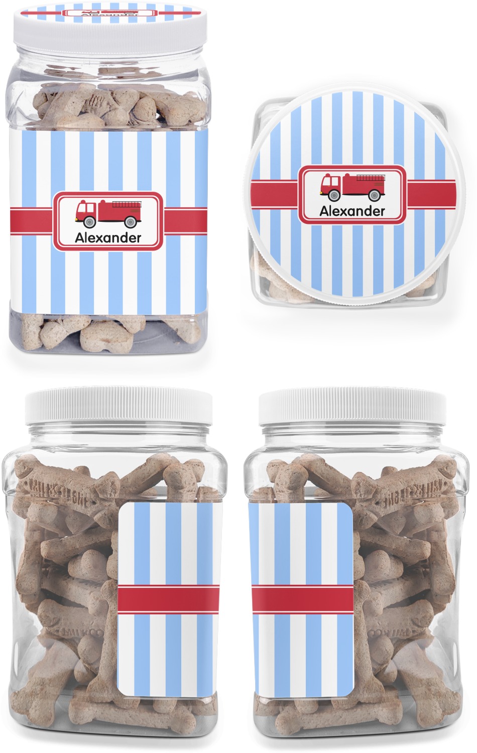 This half gallon jar, made from a sturdy plastic, is the perfect way to keep treats from any naughty pet paws, while still keeping them ready on hand for when your pup performs an impressive trick. This dog cookie jar features a screw-on, white lid that displays your personalized design on a vinyl sticker. We apply another customized sticker that wraps around the front and sides of the jar. Our dog treat jar also has indentations on the rear ends of the sides, which allows for convenient handling, and its square frame allows for easy storage.
